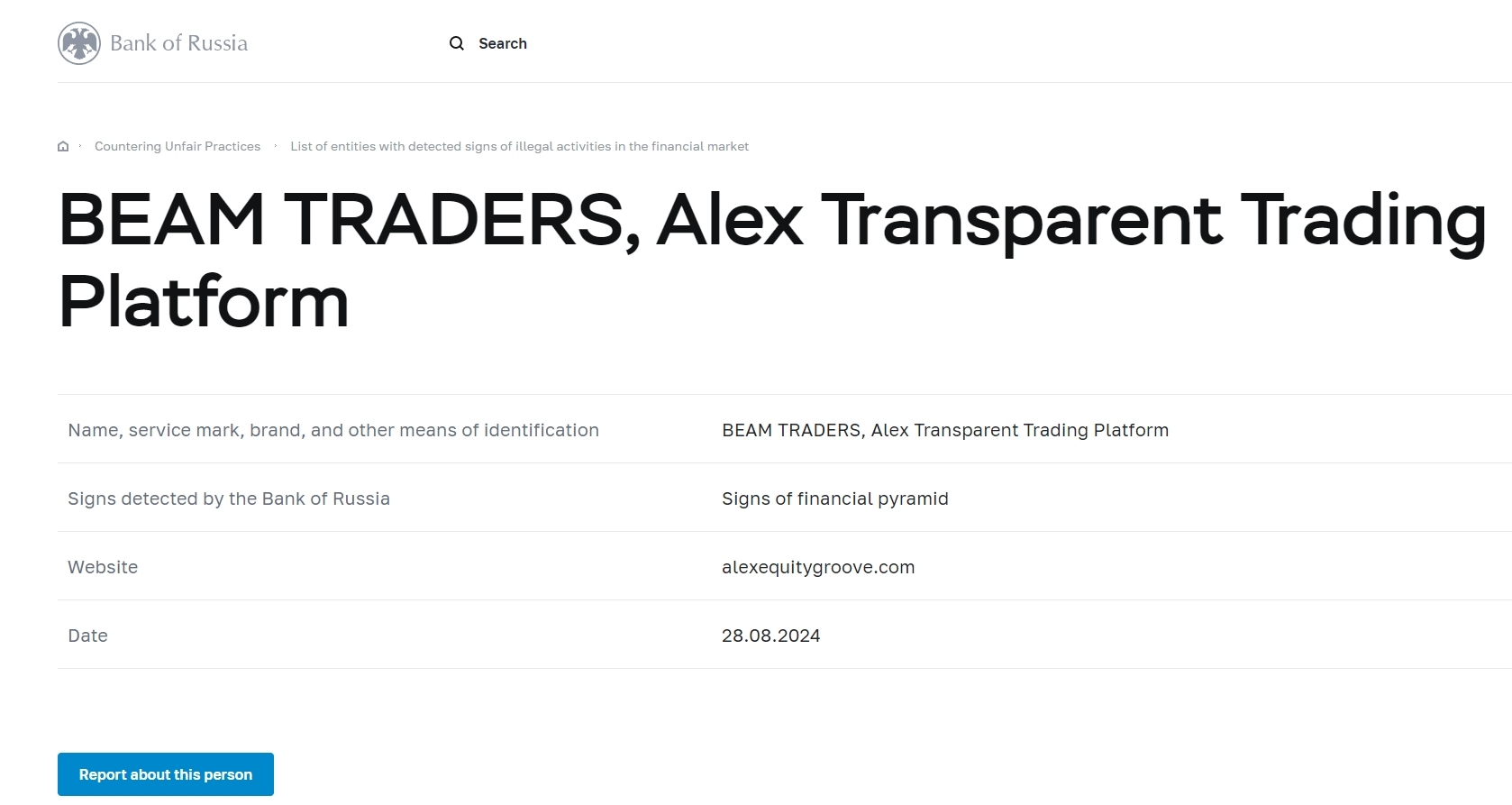 pangalan, marka ng serbisyo, tatak, at iba pang paraan ng pagkakakilanlan Beam traders , alex transparent trading platform signs na nakita ng bank of russia signs of financial pyramid website alexequitygroove.com date 28.08.2024