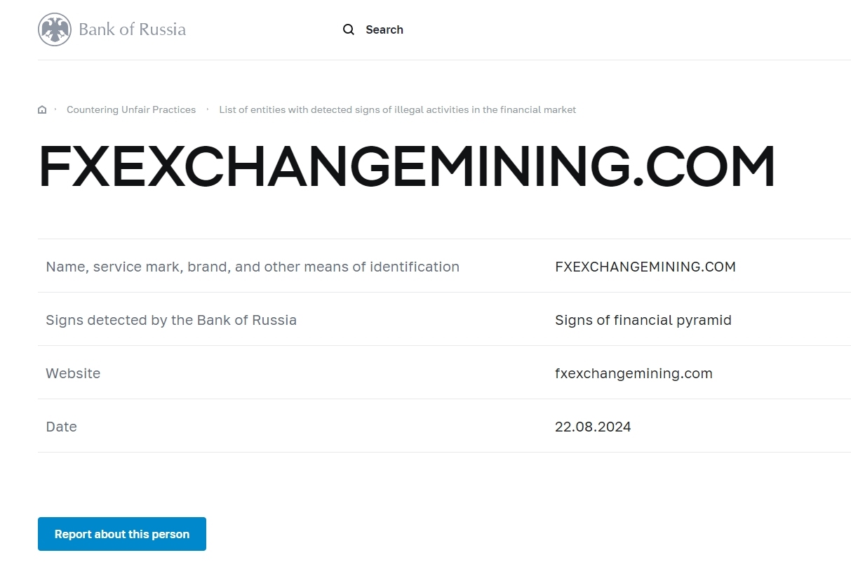 Pangalan, marka ng serbisyo, tatak, at iba pang paraan ng pagkakakilanlan FXEXCHANGEMINING.COM Mga palatandaan na nakita ng Bank of Russia Mga palatandaan ng financial pyramid Website fxexchangemining.com Petsa 22.08.2024