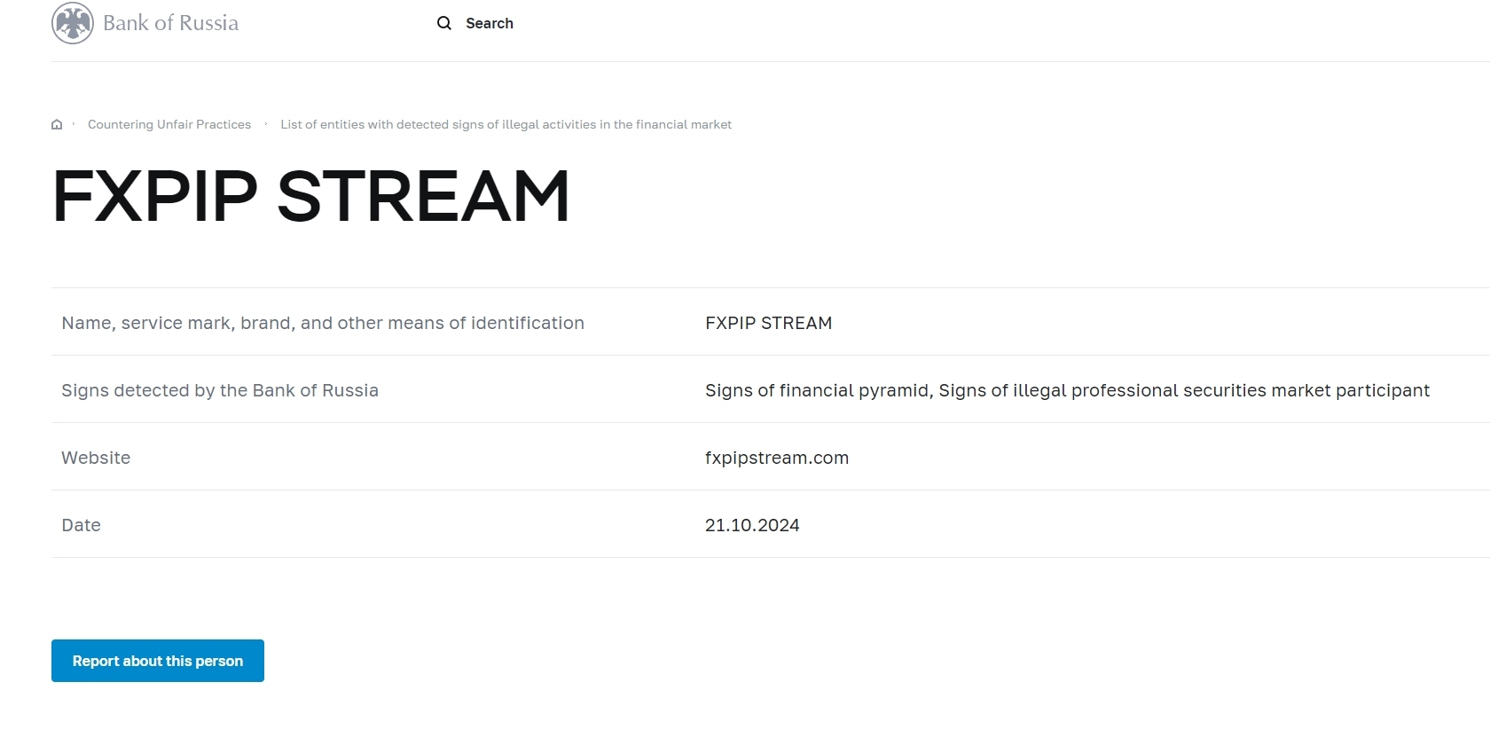 pangalan, marka ng serbisyo, tatak, at iba pang paraan ng pagkakakilanlan FXPIP STREAM mga palatandaan na nakita ng bangko ng russia mga palatandaan ng financial pyramid, mga palatandaan ng iligal na propesyonal na securities market participant website fxpipstream.com petsa 21.10.2024