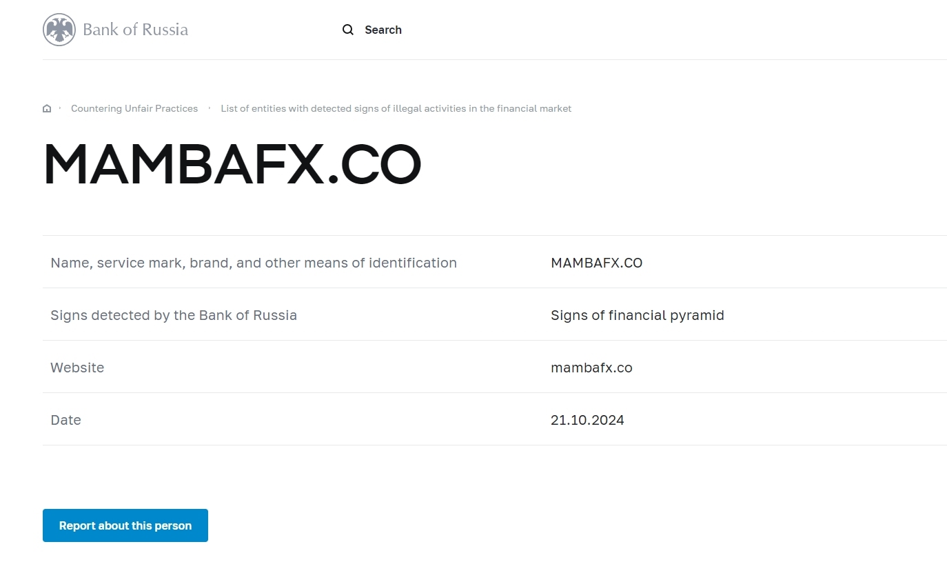 pangalan, marka ng serbisyo, tatak, at iba pang paraan ng pagkakakilanlan MambaFX .co sign na nakita ng bank of russia signs of financial pyramid website MambaFX .co petsa 21.10.2024