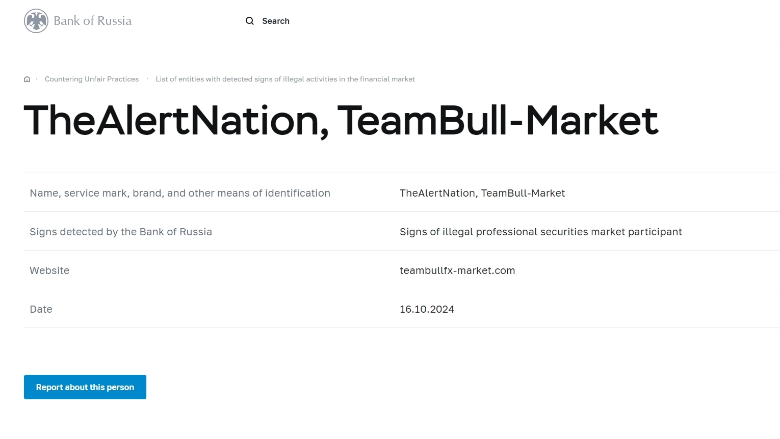 pangalan, marka ng serbisyo, tatak, at iba pang paraan ng pagkilala sa alerto, teambull-market mga palatandaan na nakita ng bangko ng russia mga palatandaan ng iligal na propesyonal na securities market participant website teambullfx-market.com petsa 16.10.2024