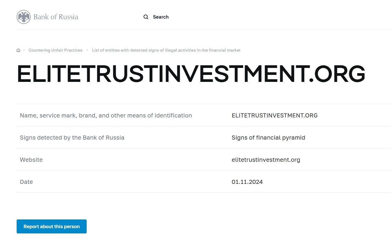 pangalan, marka ng serbisyo, tatak, at iba pang paraan ng pagkakakilanlan Elitetrust investment.org signs na nakita ng bank of russia signs of financial pyramid website Elitetrust investment.org petsa 01.11.2024