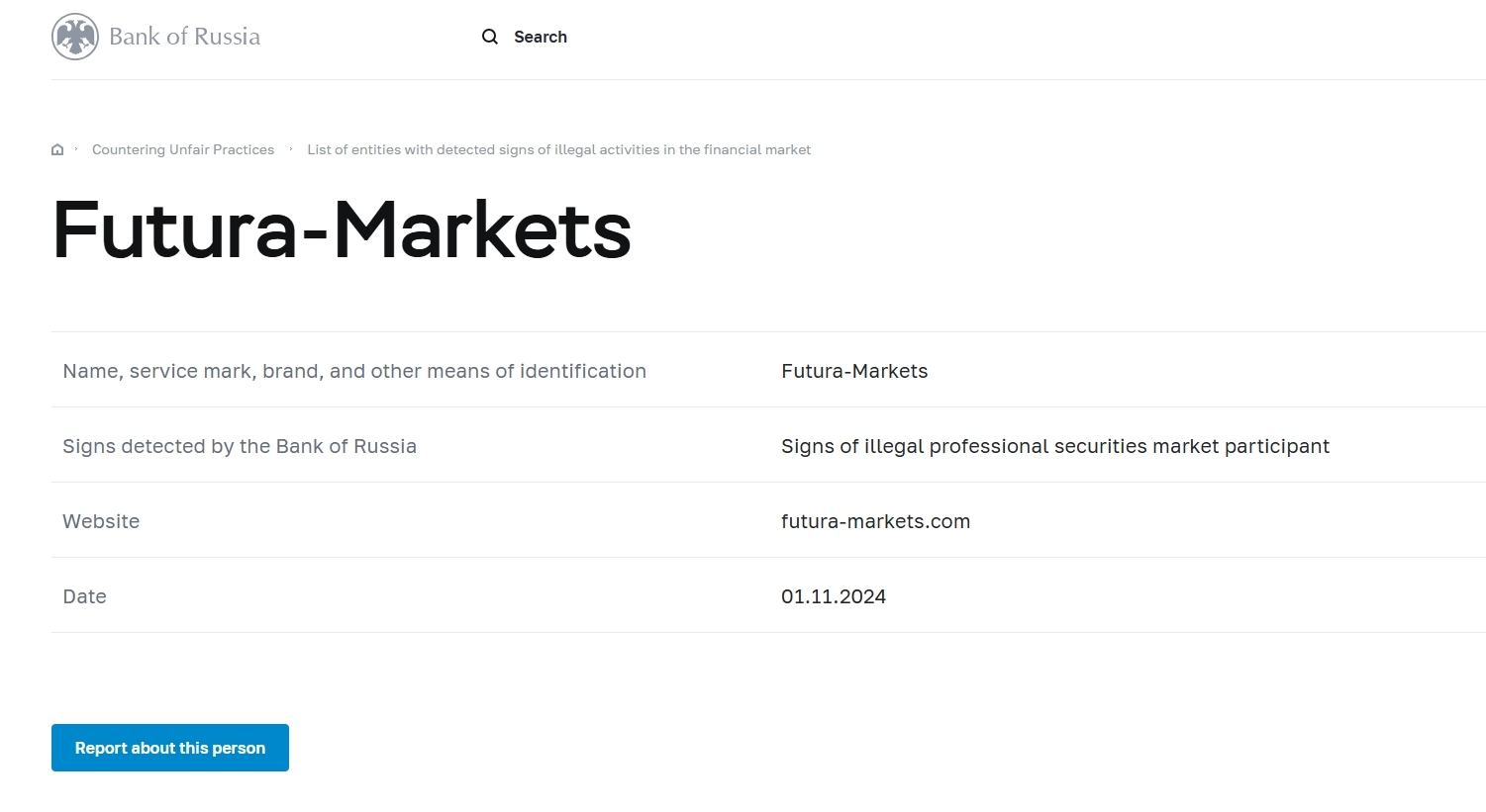 Pangalan, marka ng serbisyo, tatak, at iba pang paraan ng pagkakakilanlan Mga Futura-Markets Signs na nakita ng Bank of Russia Mga palatandaan ng ilegal na propesyonal na kalahok sa merkado ng securities Website futura-markets.com Petsa 01.11.2024
