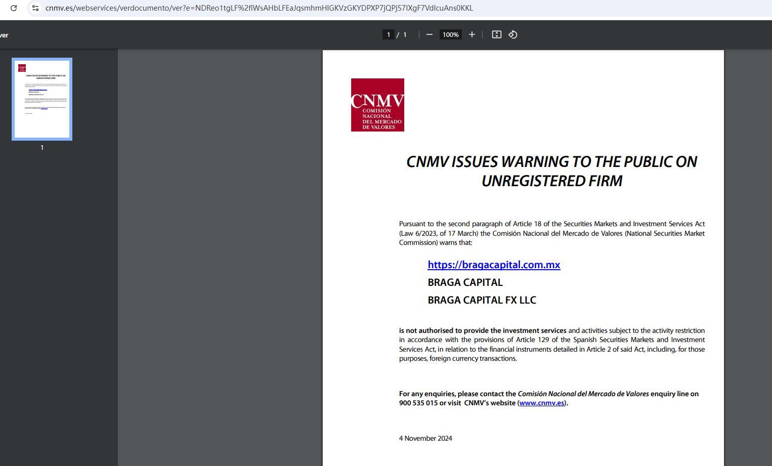 Ang cnmv ay nagbigay ng babala sa publiko sa hindi rehistradong kumpanya alinsunod sa ikalawang talata ng artikulo 18 ng securities markets and investment services act (batas 6/2023, ng 17 march) nagbabala ang comisión nacional del mercado de valores (national securities market commission) na : https://bragacapital.com.mx BRAGA CAPITAL BRAGA CAPITAL Ang fx llc ay hindi awtorisado na magbigay ng mga serbisyo at aktibidad sa pamumuhunan na napapailalim sa paghihigpit sa aktibidad alinsunod sa mga probisyon ng artikulo 129 ng batas ng mga merkado ng mga securities ng Espanya at mga serbisyo sa pamumuhunan, na may kaugnayan sa mga instrumento sa pananalapi na nakadetalye sa artikulo 2 ng nasabing batas, kasama ang , para sa mga layuning iyon, mga transaksyong foreign currency. para sa anumang mga katanungan, mangyaring makipag-ugnayan sa comisión nacional del mercado de valores na linya ng pagtatanong sa 900 535 015 o bisitahin ang website ng cnmv (www.cnmv.es). Nobyembre 4, 2024