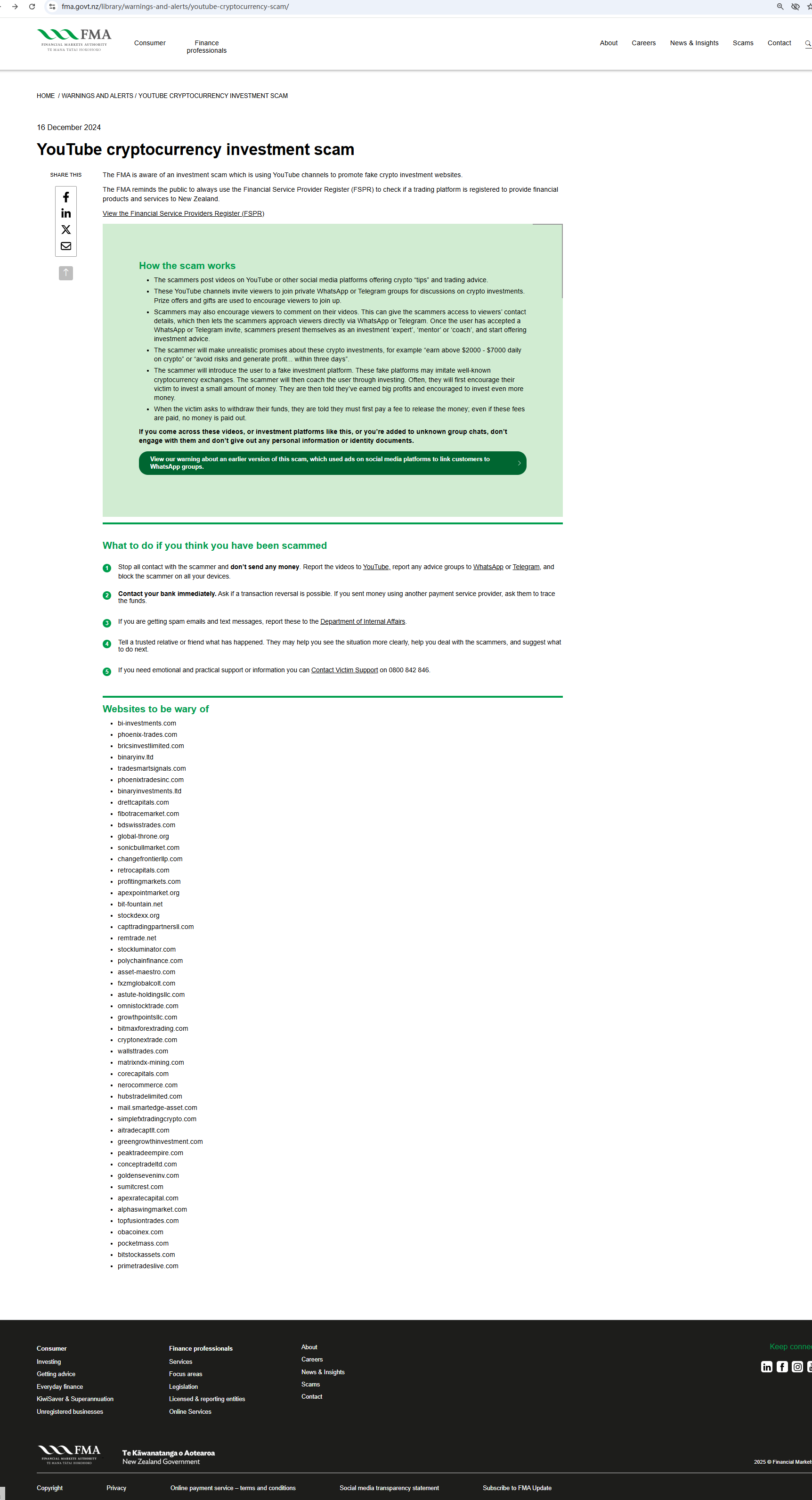 16 Disyembre 2024 YouTube cryptocurrency investment scam IBAHAGI ITO Alam ng FMA ang isang investment scam na gumagamit ng mga channel sa YouTube upang i-promote ang mga pekeng website ng pamumuhunan sa crypto. Ang FMA ay nagpapaalala sa publiko na palaging gamitin ang Financial Service Provider Register (FSPR) upang suriin kung ang isang trading platform ay nakarehistro upang magbigay ng mga produkto at serbisyo sa pananalapi sa New Zealand. Tingnan ang Financial Service Providers Register (FSPR) Paano gumagana ang scam Ang mga scammer ay nagpo-post ng mga video sa YouTube o iba pang social media platform na nag-aalok ng crypto "mga tip" at payo sa kalakalan. Ang mga channel sa YouTube na ito ay nag-aanyaya sa mga manonood na sumali sa mga pribadong grupo ng WhatsApp o Telegram para sa mga talakayan sa mga pamumuhunan sa crypto. Ang mga alok at regalo ng premyo ay ginagamit upang hikayatin ang mga manonood na sumali. Maaari ding hikayatin ng mga scammer ang mga manonood na magkomento sa kanilang mga video. Maaari itong magbigay ng access sa mga scammer sa mga detalye sa pakikipag-ugnayan ng mga manonood, na nagbibigay-daan sa mga scammer na direktang lumapit sa mga manonood sa pamamagitan ng WhatsApp o Telegram. Sa sandaling tinanggap ng user ang isang imbitasyon sa WhatsApp o Telegram, ipinapakita ng mga scammer ang kanilang sarili bilang isang 'eksperto', 'tagapagturo' o 'coach', at magsisimulang mag-alok ng payo sa pamumuhunan. Ang scammer ay gagawa ng hindi makatotohanang mga pangako tungkol sa mga pamumuhunan sa crypto na ito, halimbawa "kumita ng higit sa $2000 - $7000 araw-araw sa crypto" o "iwasan ang mga panganib at kumita... sa loob ng tatlong araw". Ipakikilala ng scammer ang gumagamit sa isang pekeng platform ng pamumuhunan. Maaaring gayahin ng mga pekeng platform na ito ang mga kilalang palitan ng cryptocurrency. Ang scammer ay magtuturo sa gumagamit sa pamamagitan ng pamumuhunan. Kadalasan, hikayatin muna nila ang kanilang biktima na mamuhunan ng maliit na halaga ng pera. Pagkatapos ay sinabihan sila na nakakuha sila ng malaking kita at hinikayat na mamuhunan ng mas maraming pera. Kapag hiniling ng biktima na bawiin ang kanilang mga pondo, sasabihin sa kanila na kailangan muna nilang magbayad ng bayad upang mailabas ang pera; kahit na binayaran ang mga bayarin na ito, walang ibinabayad na pera. Kung makikita mo ang mga video na ito, o mga platform ng pamumuhunan na tulad nito, o idinagdag ka sa mga hindi kilalang panggrupong chat, huwag makipag-ugnayan sa kanila at huwag magbigay ng anumang personal na impormasyon o mga dokumento ng pagkakakilanlan. Tingnan ang aming babala tungkol sa mas naunang bersyon ng scam na ito, na gumamit ng mga ad sa mga platform ng social media upang i-link ang mga customer sa mga pangkat ng WhatsApp. Ano ang gagawin kung sa tingin mo ay na-scam ka Itigil ang lahat ng pakikipag-ugnayan sa scammer at huwag magpadala ng anumang pera. Iulat ang mga video sa YouTube, iulat ang anumang mga grupo ng payo sa WhatsApp o Telegram, at i-block ang scammer sa lahat ng iyong device. Makipag-ugnayan kaagad sa iyong bangko. Tanungin kung posible ang pagbabalik ng transaksyon. Kung nagpadala ka ng pera gamit ang ibang provider ng serbisyo sa pagbabayad, hilingin sa kanila na i-trace ang mga pondo. Kung nakakatanggap ka ng mga spam na email at text message, iulat ito sa Department of Internal Affairs. Sabihin sa isang pinagkakatiwalaang kamag-anak o kaibigan kung ano ang nangyari. Maaari silang tulungan kang makita ang sitwasyon nang mas malinaw, tulungan kang harapin ang mga scammer, at magmungkahi kung ano ang susunod na gagawin. Kung kailangan mo ng emosyonal at praktikal na suporta o impormasyon maaari kang Makipag-ugnayan sa Suporta sa Biktima sa 0800 842 846. Mga website na dapat mag-ingat sa bi-investments.com phoenix-trades.com bricsinvestlimited.com binaryinv.ltd tradesmartsignals.com phoenixtradesinc.com binaryinvestments.ltd. global-throne.org sonicbullmarket.com changefrontierllp.com retrocapitals.com profitingmarkets.com apexpointmarket.org bit-fountain.net stockdexx.org capttradingpartnersll.com remtrade.net stockluminator.com polychainfinance.com asset-maestro.com fxzmglobaltecomt-holdings.com growthpointsllc.com bitmaxforextrading.com cryptonextrade.com wallsttrades.com matrixndx-mining.com corecapitals.com nerocommerce.com hubstradelimited.com mail.smartedge-asset.com simplefxtradingcrypto.com aitradecaptlt.com greengrowthinvestment.com peaktraensevinvestment.com sumitcrest.com apexratecapital.com alphaswingmarket.com topfusiontrades.com obacoinex.com pocketmass.com bitstockassets.com primetradeslive.com