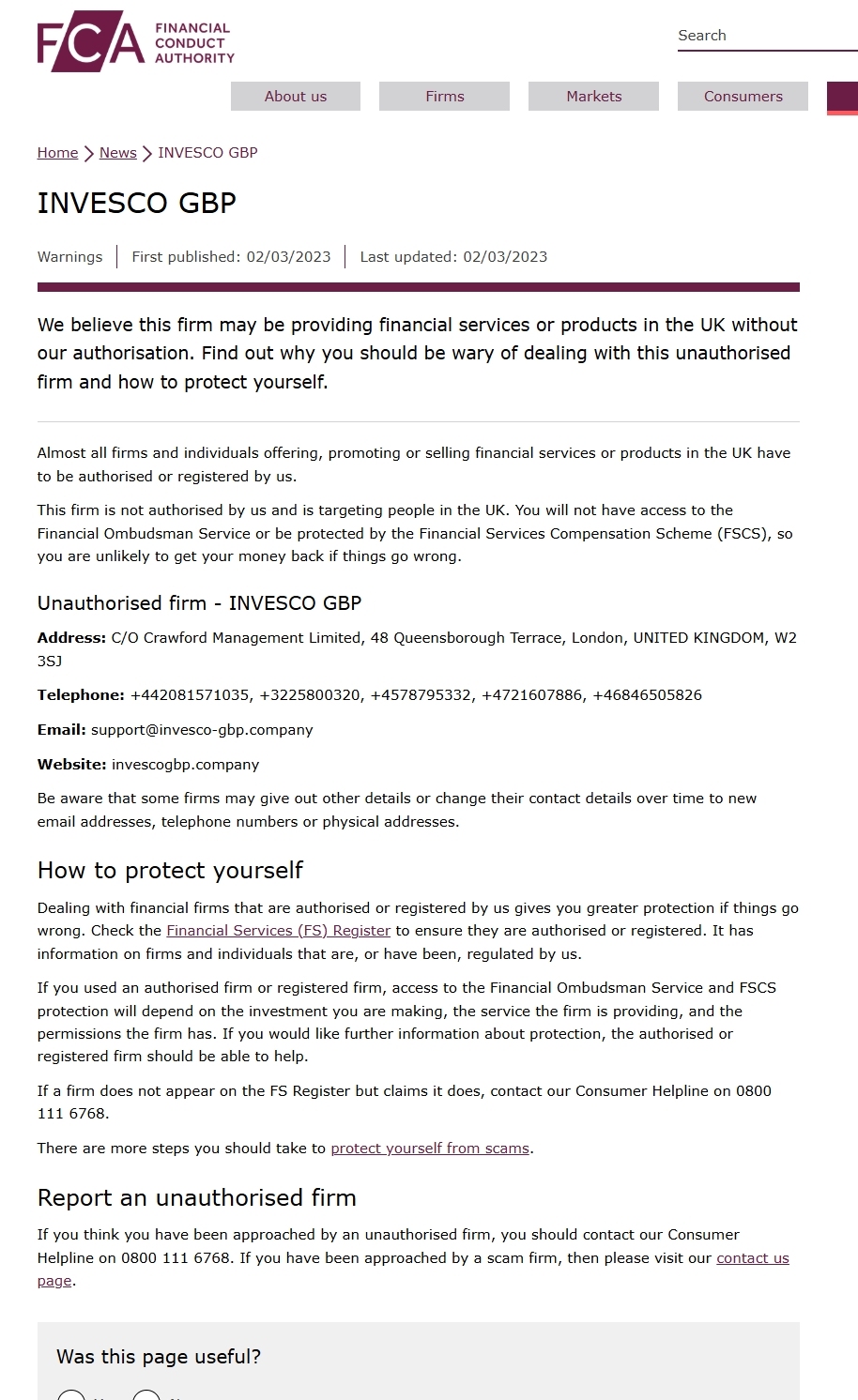 Listahan ng Babala ng FCA sa mga hindi awtorisadong kumpanya INVESCO GBP.