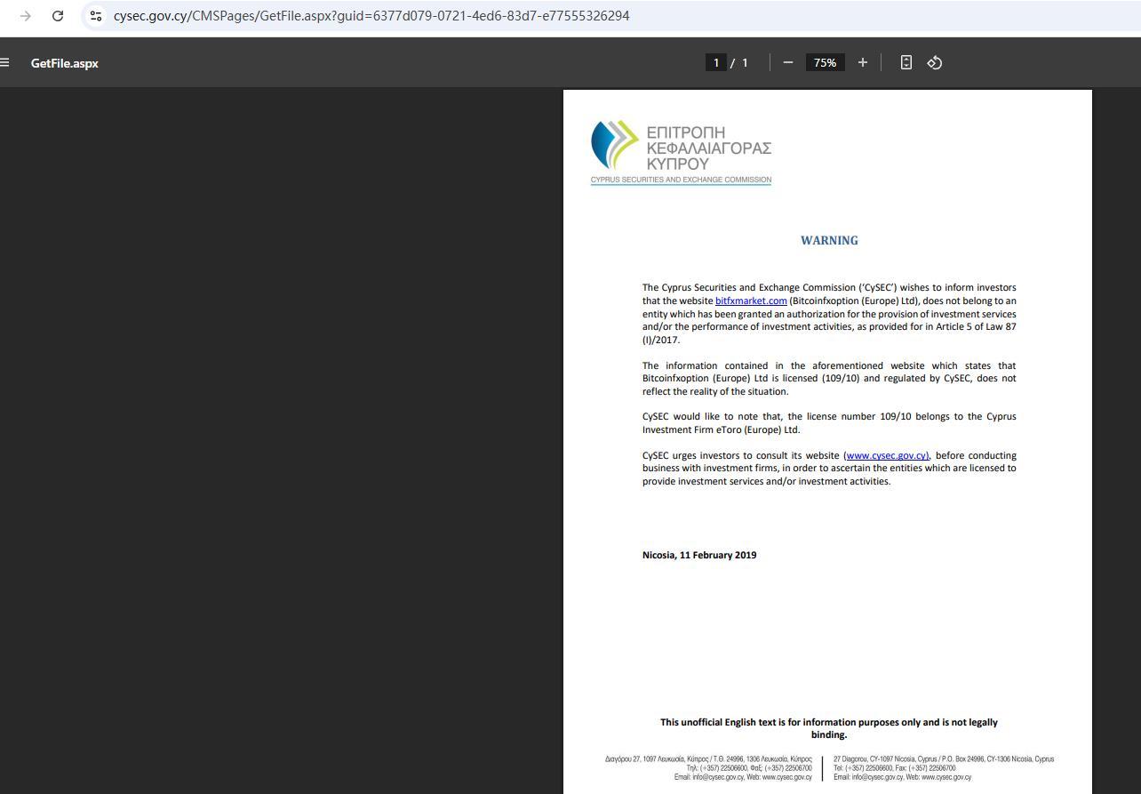 • Dahilan ng parusa nais ng cyprus securities and exchange commission ('cysec') na ipaalam sa mga namumuhunan na ang website BitFxMarket Ang .com (bitcoinfxoption (europe) ltd), ay hindi kabilang sa isang entity na nabigyan ng awtorisasyon para sa pagbibigay ng mga serbisyo sa pamumuhunan at/o ang pagganap ng mga aktibidad sa pamumuhunan, gaya ng itinatadhana sa artikulo 5 ng batas 87 (i)/2017.