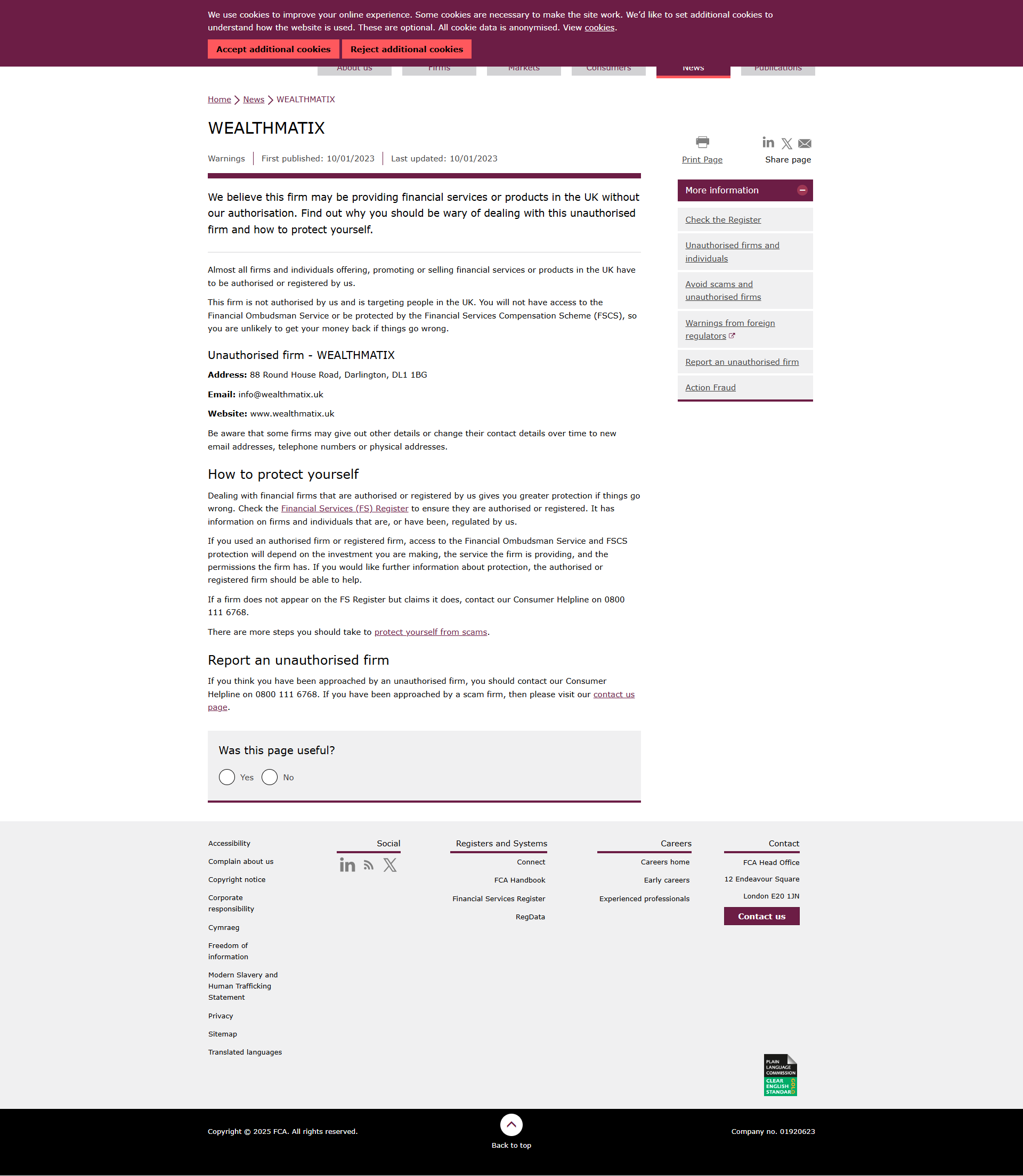 Listahan ng Babala ng FCA ng mga hindi awtorisadong kumpanya WEALTHMATIX.