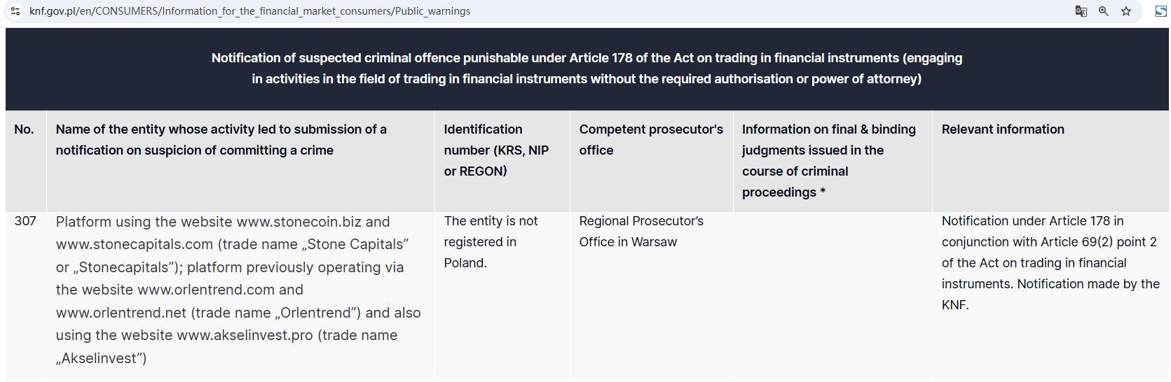 platform gamit ang website www.stonecoin.biz at www. Stonecapitals .com (pangalan ng kalakalan "mga kabisera ng bato" o " Stonecapitals ”); platform na dati nang tumatakbo sa pamamagitan ng website na www.orlentrend.com at www.orlentrend.net (trade name „orlentrend”) at ginagamit din ang website na www. AKSELINVEST .pro (pangalan ng kalakalan „ AKSELINVEST ”) ang entity ay hindi nakarehistro sa poland. regional prosecutor's office sa warsaw notification sa ilalim ng artikulo 178 kasabay ng artikulo 69(2) point 2 ng batas sa pangangalakal ng mga instrumentong pinansyal. abiso na ginawa ng knf. .