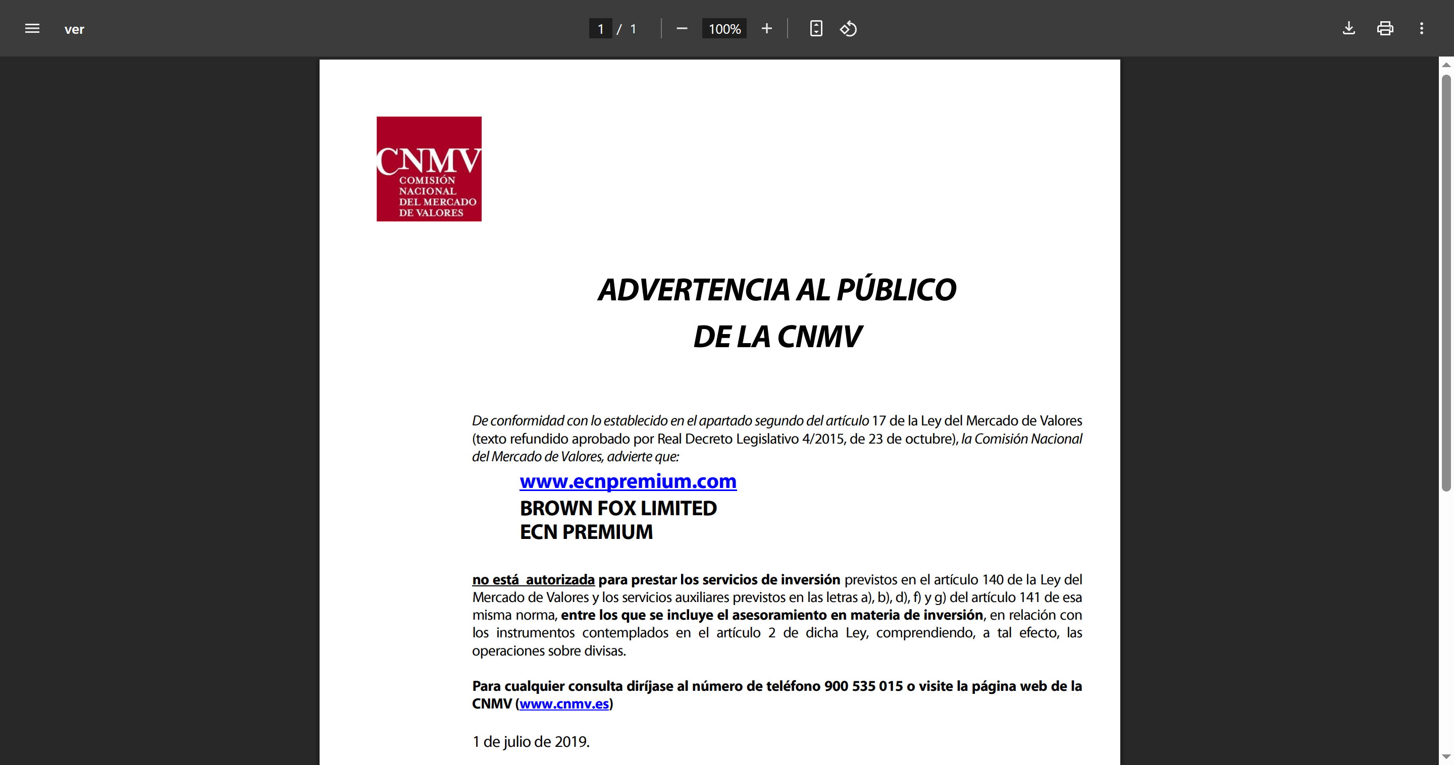 Pampublikong abiso mula sa CNMV alinsunod sa mga probisyon ng ikalawang seksyon ng artikulo 17 ng Securities Market Law (pinagsama-samang teksto na inaprubahan ng Royal Legislative Decree 4/2015, ng Oktubre 23), ang National Securities Market Commission ay nagbabala na: www. ECNpremium .com limitado ang brown fox ECN Premium Hindi awtorisadong ibigay ang mga serbisyo sa pamumuhunan na ibinigay para sa Artikulo 140 ng Securities Market Law at ang mga karagdagang serbisyong ibinigay para sa mga titik a), b), d), f) at g) ng Artikulo 141 ng parehong batas na iyon, na kinabibilangan ng payo sa pamumuhunan, kaugnay ng mga instrumentong pinag-isipan sa Artikulo 2 ng nasabing batas, kasama, para sa layuning ito, ang mga transaksyon sa pera. Para sa anumang mga katanungan, mangyaring tumawag sa 900 535 015 o bisitahin ang website ng CNMV (www.cnmv.es) Hulyo 1, 2019.