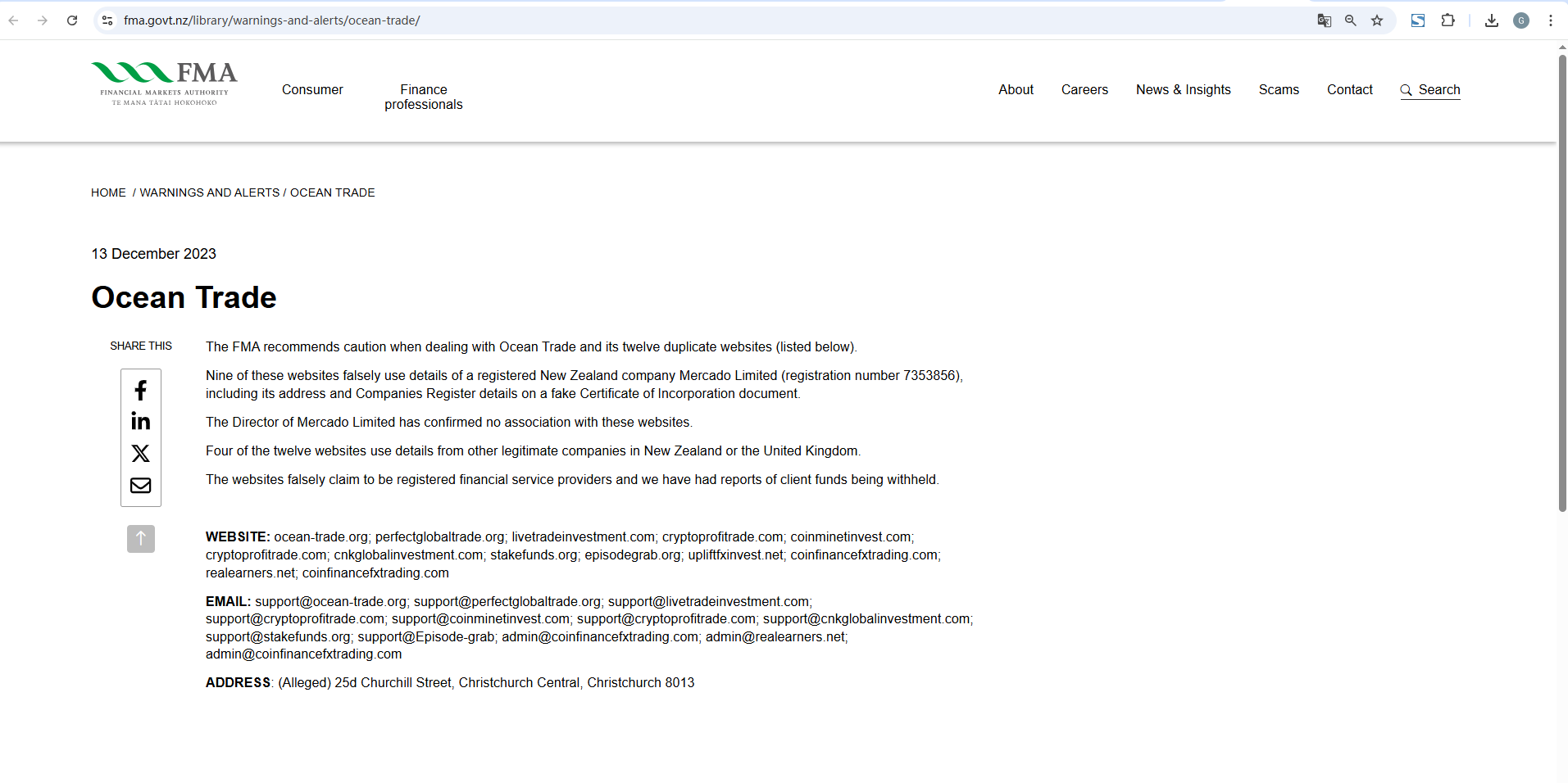 Disyembre 13, 2023 ibinahagi ito ng kalakalan sa karagatan na inirerekomenda ng fma ang pag-iingat kapag nakikitungo sa kalakalan sa karagatan at sa labindalawang duplicate na website nito (nakalista sa ibaba). siyam sa mga website na ito ay maling gumagamit ng mga detalye ng isang rehistradong kumpanya ng new zealand mercado limited (numero ng pagpaparehistro 7353856), kasama ang address nito at mga detalye ng pagpaparehistro ng mga kumpanya sa isang pekeng dokumento ng certificate of incorporation. ang direktor ng mercado limited ay nakumpirma na walang kaugnayan sa mga website na ito. apat sa labindalawang website ang gumagamit ng mga detalye mula sa ibang mga lehitimong kumpanya sa new zealand o sa united kingdom. maling sinasabi ng mga website na sila ay mga rehistradong tagapagbigay ng serbisyo sa pananalapi at mayroon kaming mga ulat ng mga pondo ng kliyente na pinipigilan. website: ocean-trade .org; perfectglobaltrade.org; livetradeinvestment.com; cryptoprofitrade.com; coinminetinvest.com; cryptoprofitrade.com; cnkglobalinvestment.com; stakefunds.org; episodegrab.org; upliftfxinvest.net; coinfinancefxtrading.com; realearners.net; coinfinancefxtrading.com email: support@ ocean-trade .org; support@perfectglobaltrade.org; support@livetradeinvestment.com; support@cryptoprofitrade.com; support@coinminetinvest.com; support@cryptoprofitrade.com; support@cnkglobalinvestment.com; support@stakefunds.org; support@episode-grab; admin@coinfinancefxtrading.com; admin@realearners.net; admin@coinfinancefxtrading.com address: (diumano) 25d churchill street, christchurch central, christchurch 8013