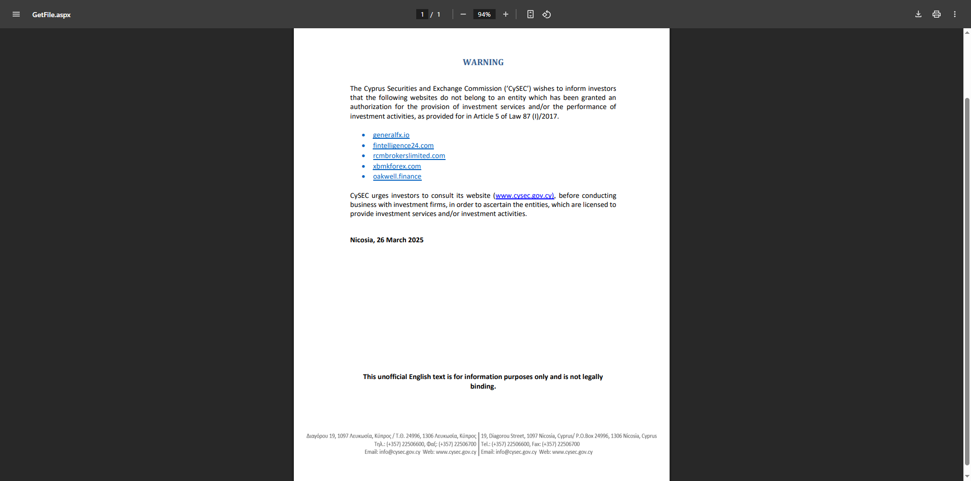 Nais ng Cyprus Securities and Exchange Commission ('CySEC') na ipaalam sa mga mamumuhunan na ang mga sumusunod na website ay hindi kabilang sa isang entity na nabigyan ng awtorisasyon para sa pagbibigay ng mga serbisyo sa pamumuhunan at/o ang pagganap ng mga aktibidad sa pamumuhunan, gaya ng itinatadhana sa Artikulo 5 ng Batas 87 (I)/2017. • generalfx.io • fintelligence24.com • rcmbrokerslimited.com • xbmkforex.com • oakwell.finance Ang CySEC ay humihimok sa mga mamumuhunan na kumonsulta sa website nito (www.cysec.gov.cy), bago magsagawa ng negosyo sa mga kumpanya ng pamumuhunan, upang matiyak ang mga entity, na may lisensyang magbigay ng mga serbisyo sa pamumuhunan at/o mga aktibidad sa pamumuhunan. Nicosia, 26 Marso 2025