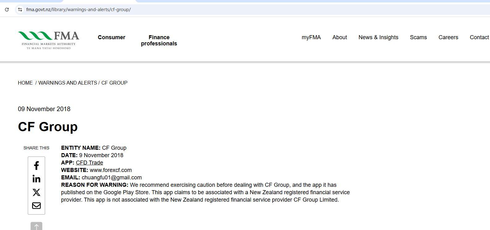 09 Nobyembre 2018 Grupo ng CF SHARE ITO ENTITY NAME: CF Group PETSA: 9 Nobyembre 2018 APP: CFD Trade WEBSITE: www.forexcf.com EMAIL: chuangfu01@gmail.com DAHILAN NG BABALA: Inirerekomenda namin ang pag-iingat bago makipag-ugnayan sa CF Group, at ang app na na-publish nito sa Google Play Store. Sinasabi ng app na ito na nauugnay sa isang rehistradong tagapagbigay ng serbisyo sa pananalapi sa New Zealand. Ang app na ito ay hindi nauugnay sa nakarehistrong New Zealand na tagapagbigay ng serbisyo sa pananalapi na CF Group Limited..