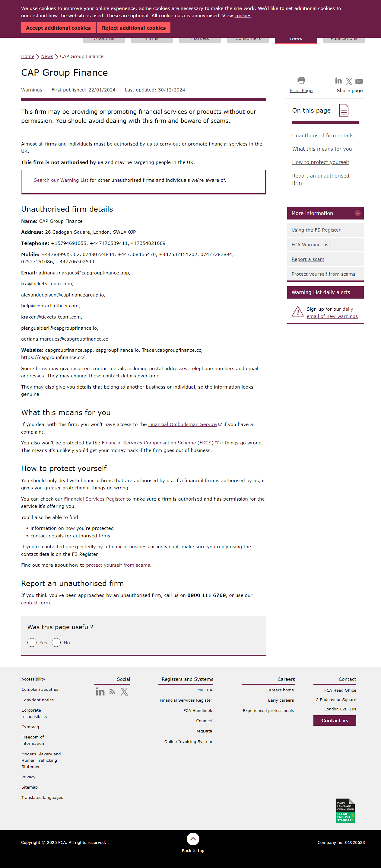 Ang firmang ito ay maaaring nagbibigay o nagpo-promote ng mga serbisyo o produkto sa pananalapi nang walang aming pahintulot. Dapat mong iwasan ang pakikipag-transaksyon sa firmang ito at mag-ingat sa mga scam. Sa pahinang ito Mga detalye ng hindi awtorisadong firma Paano protektahan ang iyong sariliI-ulat ang isang hindi awtorisadong firma Halos lahat ng mga firma at indibidwal ay dapat na awtorisado namin upang magsagawa o mag-promote ng mga serbisyo sa pananalapi sa UK. Ang firmang ito ay hindi awtorisado namin at maaaring nagta-target ng mga tao sa UK. Hanapin sa aming Warning List ang iba pang mga hindi awtorisadong firma at indibidwal na aming alam. Mga detalye ng hindi awtorisadong firma Pangalan: CAP Group Finance Address: 26 Cadogan Square, London, SW1X 0JP Telepono: +15794691055, +447476539411, 447354021089 Mobile: +447899935302, 07480724844, +447308465470, +447537151202, 07477287894, 07537151086, +447706302549 Email: [email protected],[email protected],[email protected],[email protected],[email protected],[email protected],[email protected] Website: capgroupfinance.app, capgroupfinance.io, Trader.capgroupfinance.cc, https://capgroupfinance.cc/ Ang ilang mga firma ay maaaring magbigay ng hindi tamang mga detalye ng contact kabilang ang postal address, numero ng telepono at email address. Maaari nilang baguhin ang mga contact detail na ito sa paglipas ng panahon. Maaari rin nilang ibigay sa iyo ang mga detalye na pagmamay-ari ng ibang negosyo o indibidwal, kaya mukhang tunay ang impormasyon..