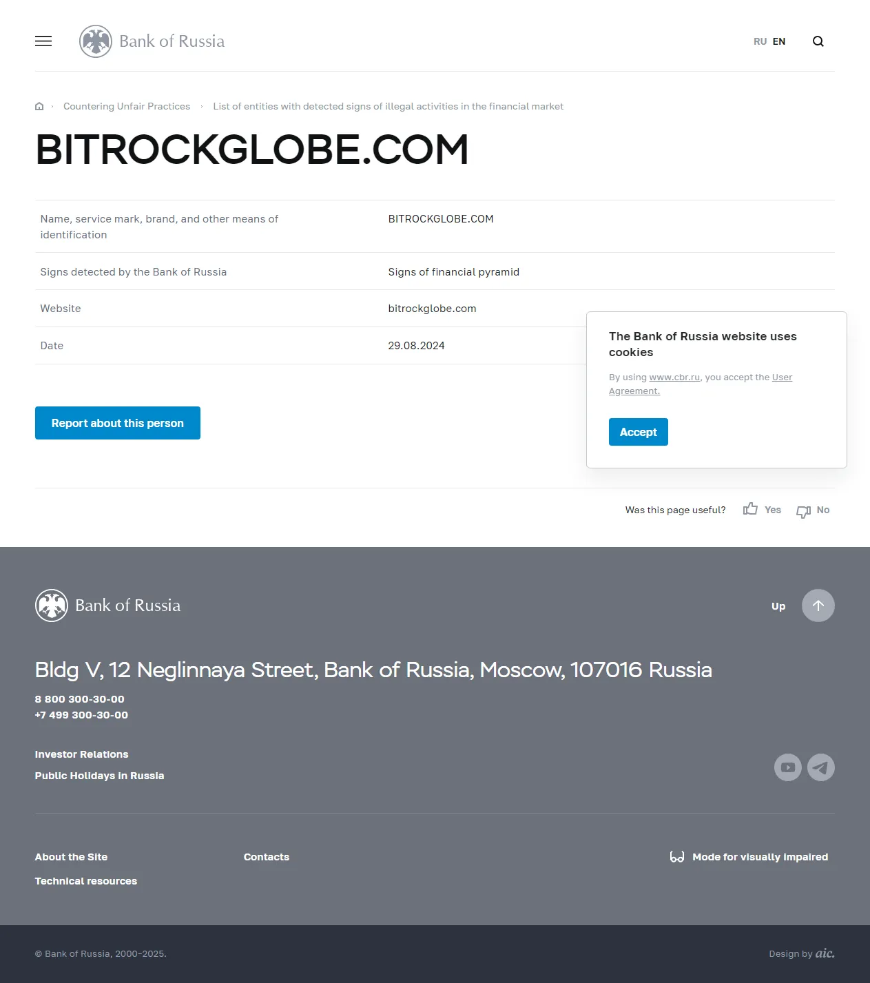 Pangalan, tatak ng serbisyo, tatak, at iba pang paraan ng pagkilala BITROCKGLOBE.COM Mga palatandaang nakita ng Bangko ng Russia Mga palatandaan ng piramide sa pananalapi Website bitrockglobe.com Petsa 29.08.2024.