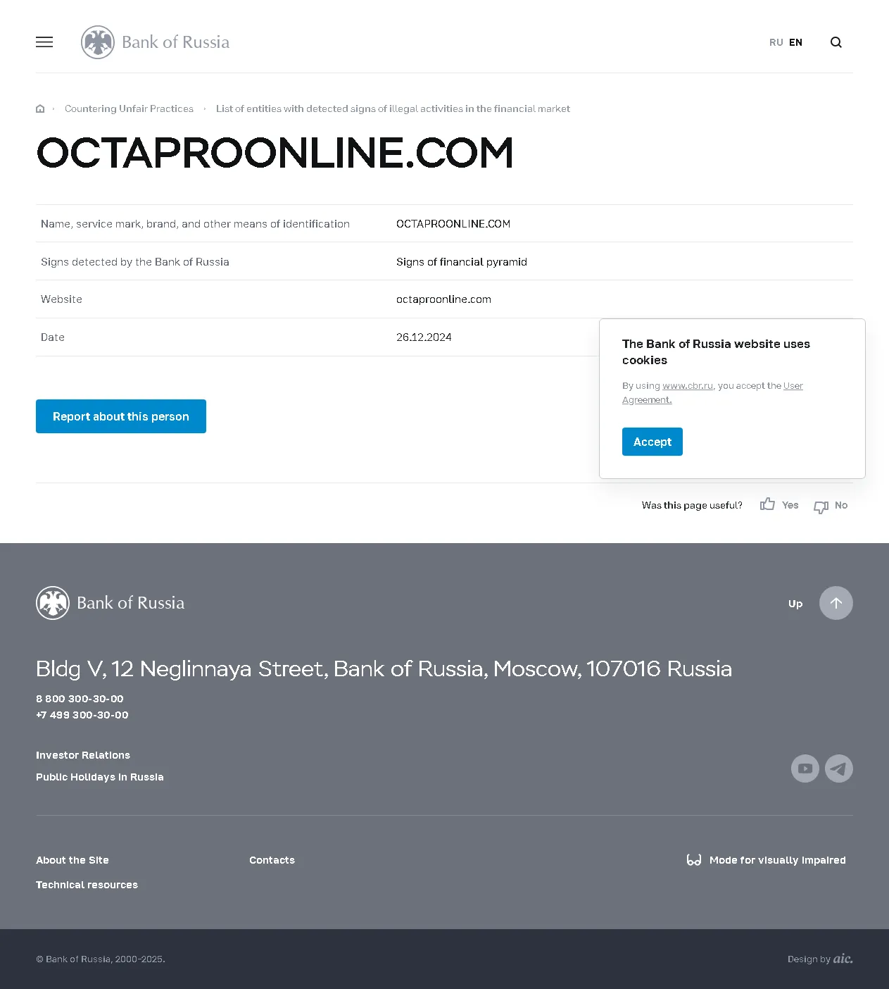 Pangalan, marka ng serbisyo, tatak, at iba pang paraan ng pagkilala OCTAPROONLINE.COM Mga palatandaan na napansin ng Bangko ng Rusya Mga palatandaan ng pyramidong pinansyal Website octaproonline.com Petsa 26.12.2024.