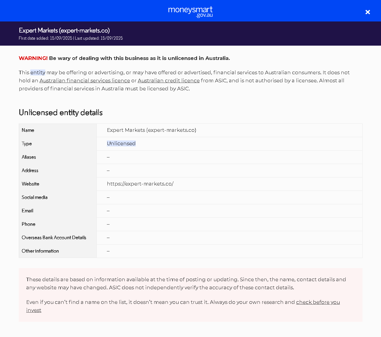 PangalanExpert Markets (expert-markets.co) UriHindi LisensyadoNag-aalok ng mga serbisyong pampinansyal (kabilang ang mga produkto sa pananalapi) sa mga tao sa Australia nang walang lisensya. Wala silang Australian financial services (AFS) licence o Australian credit licence mula sa ASIC. Mga Pangalan– Address– Websitehttps://expert-markets.co/ Social media– Email– Telepono– Mga Detalye ng Bank Account sa Ibang Bansa– Iba pang impormasyon–.