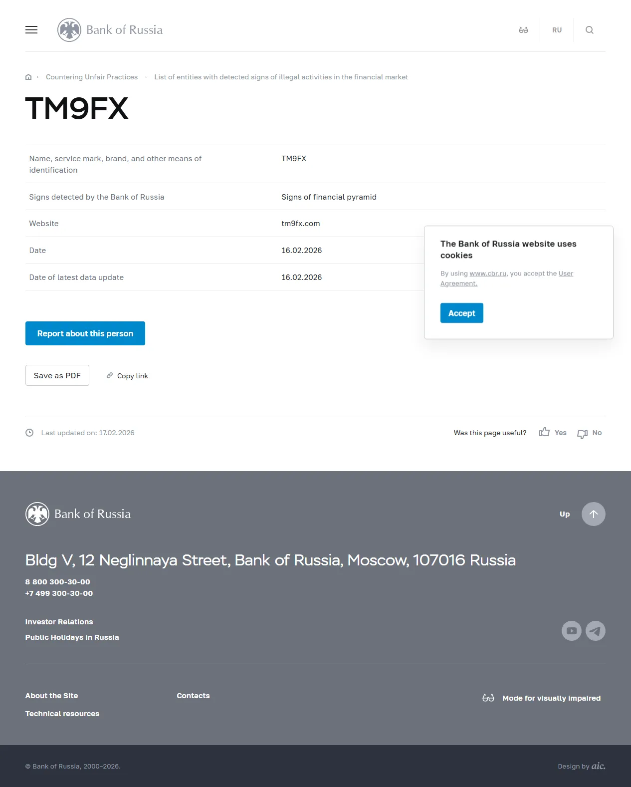 Pangalan, marka ng serbisyo, tatak, at iba pang paraan ng pagkilala TM9FX Mga Palatandaang Natukoy ng Bangko ng Russia Mga Palatandaan ng Pyramidong Pinansyal Website tm9fx.com Petsa 16.02.2026 Petsa ng pinakabagong pag-update ng datos 16.02.2026.