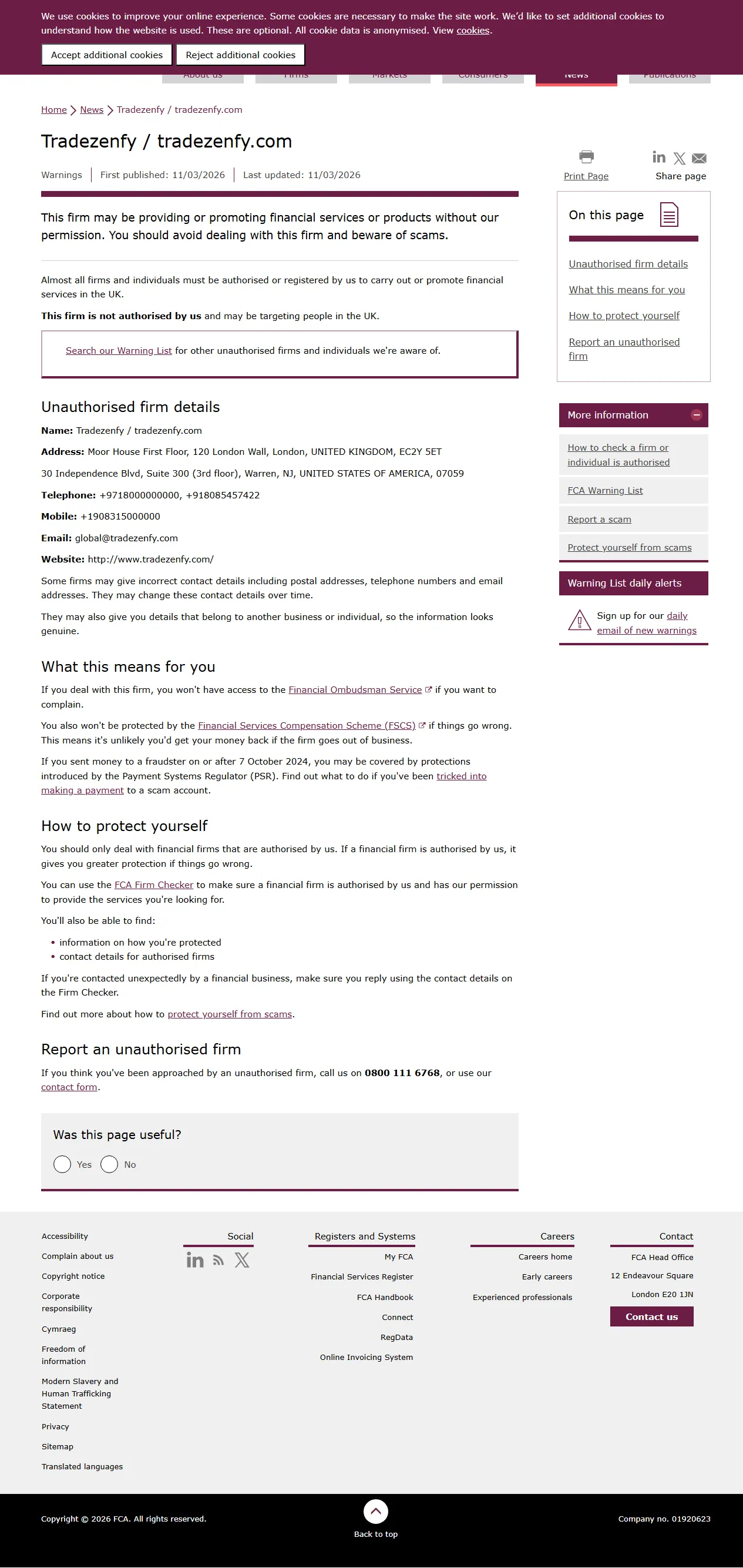 ['Ang kumpanyang ito ay maaaring nagbibigay o nagpo-promote ng mga serbisyong pinansyal o mga produkto nang walang pahintulot namin. Dapat mong iwasang makipag-transaksyon sa kumpanyang ito at mag-ingat sa mga scam. Halos lahat ng mga kumpanya at indibidwal ay dapat na may awtorisasyon o nakarehistro sa amin upang magsagawa o mag-promote ng mga serbisyong pinansyal sa UK. Ang kumpanyang ito ay hindi awtorisado ng amin at maaaring nagta-target ng mga tao sa UK. Hanapin sa aming Warning List ang iba pang mga hindi awtorisadong kumpanya at indibidwal na alam namin. Mga detalye ng hindi awtorisadong kumpanya Pangalan: Tradezenfy / tradezenfy.com Address: Moor House First Floor, 120 London Wall, London, UNITED KINGDOM, EC2Y 5ET30 Independence Blvd, Suite 300 (ika-3 palapag), Warren, NJ, UNITED STATES OF AMERICA, 07059 Telephone: +9718000000000, +918085457422 Mobile: +1908315000000 Email: global@tradezenfy.com Website: http://www.tradezenfy.com/ Ang ilang mga kumpanya ay maaaring magbigay ng maling mga detalye ng kontak kabilang ang mga postal address, numero ng telepono at email address. Maaari nilang baguhin ang mga detalye ng kontak na ito sa paglipas ng panahon. Maaari rin nilang ibigay sa iyo ang mga detalye na pagmamay-ari ng ibang negosyo o indibidwal, kaya mukhang tunay ang impormasyon. '].