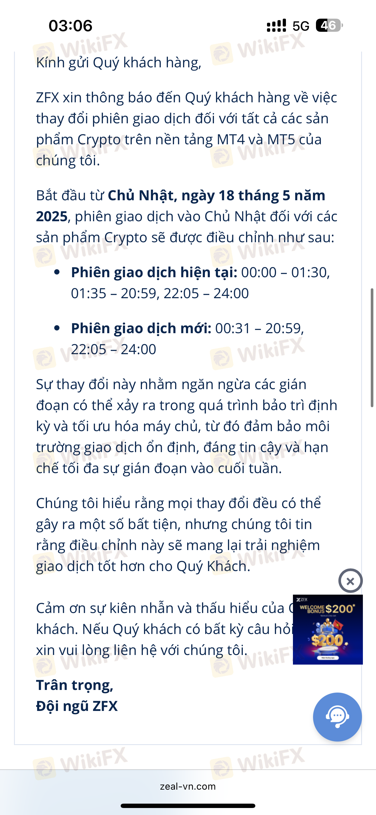 ZFX Việt Nam không gửi thông báo hay email về vấn đề giờ giao dịch cho khách hàng hay IB.