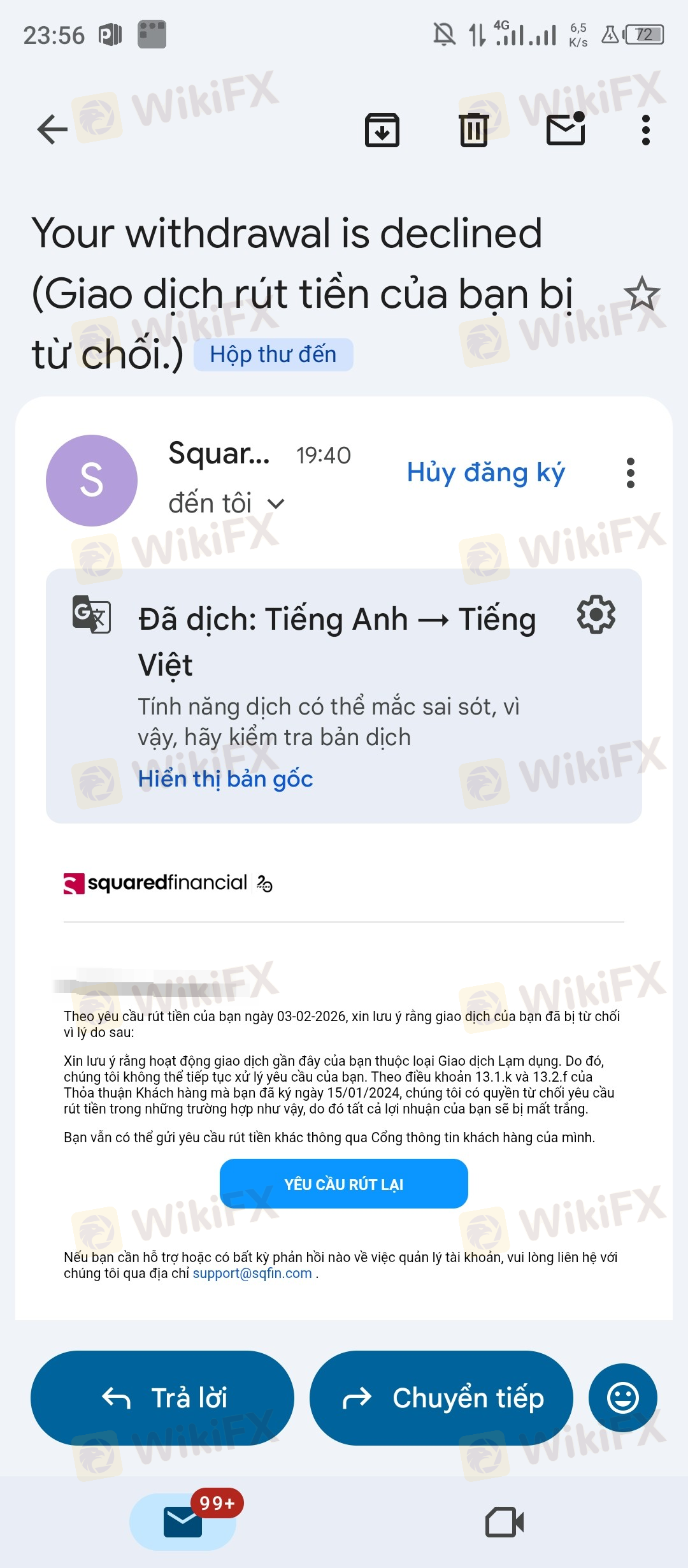 Kamusta, nagtatake ako ng transaksyon sa isang kumpanyang tinatawag na Squared, at pagkatapos ay nagpadala sila sa akin ng hindi kaukulang email at binura ang aking pera. Hindi patas na kinansela nila ang buong bahagi ng aking kita sa pamamagitan ng pagbibigay ng isang nakakatawang dahilan at pagbanggit ng mga ipinagbabawal na transaksyon. At hindi ko tinatanggap ito. May mahalagang data sa Amerika noong 05.01.2024 at kumita ako sa paraang ito, pagkatapos ay nagpatuloy ako sa aking mga transaksyon, ngunit ginawa nila ang pagbura noong 09.01.2024, gusto ko na kumuha ng kinakailangang aksyon, ako ay nagdaranas ng hindi patas na pagdudusa...