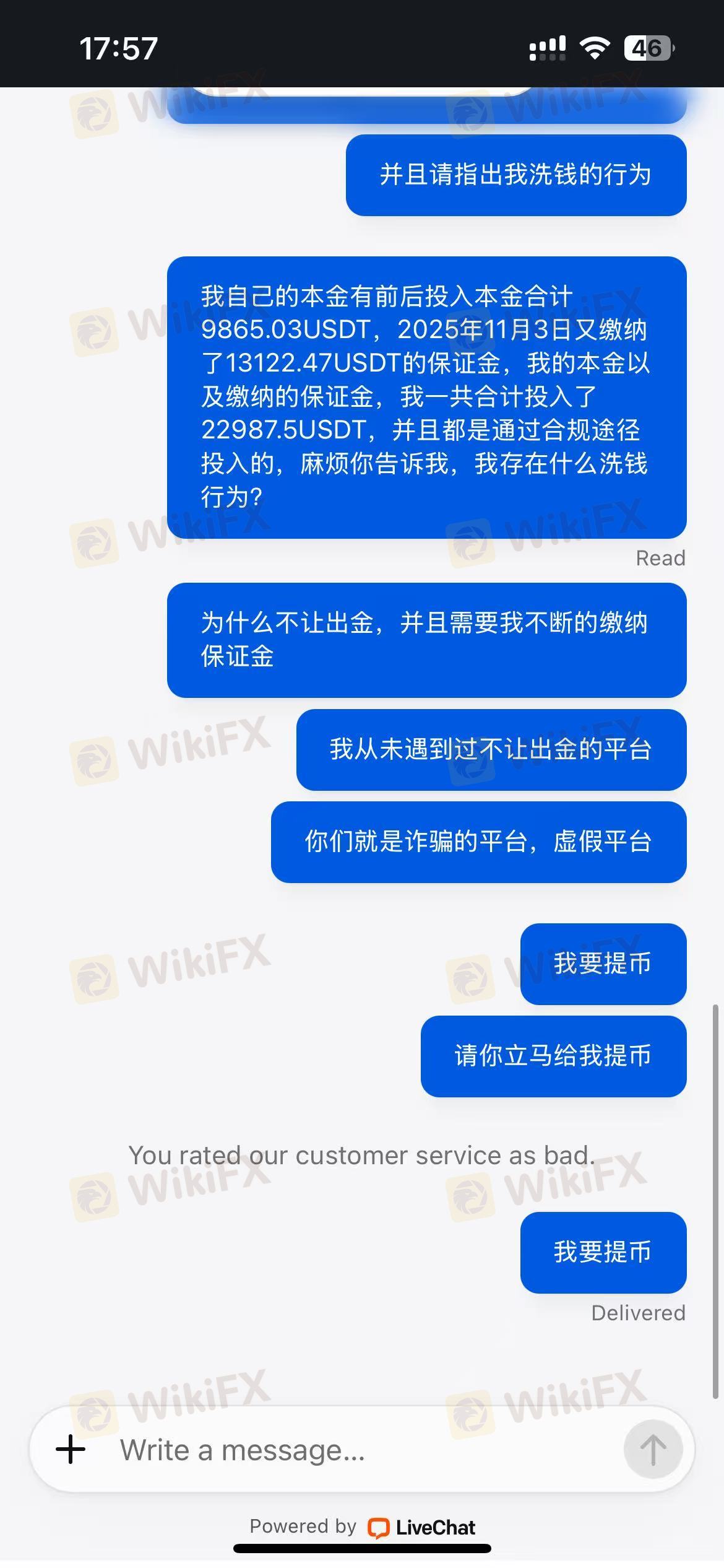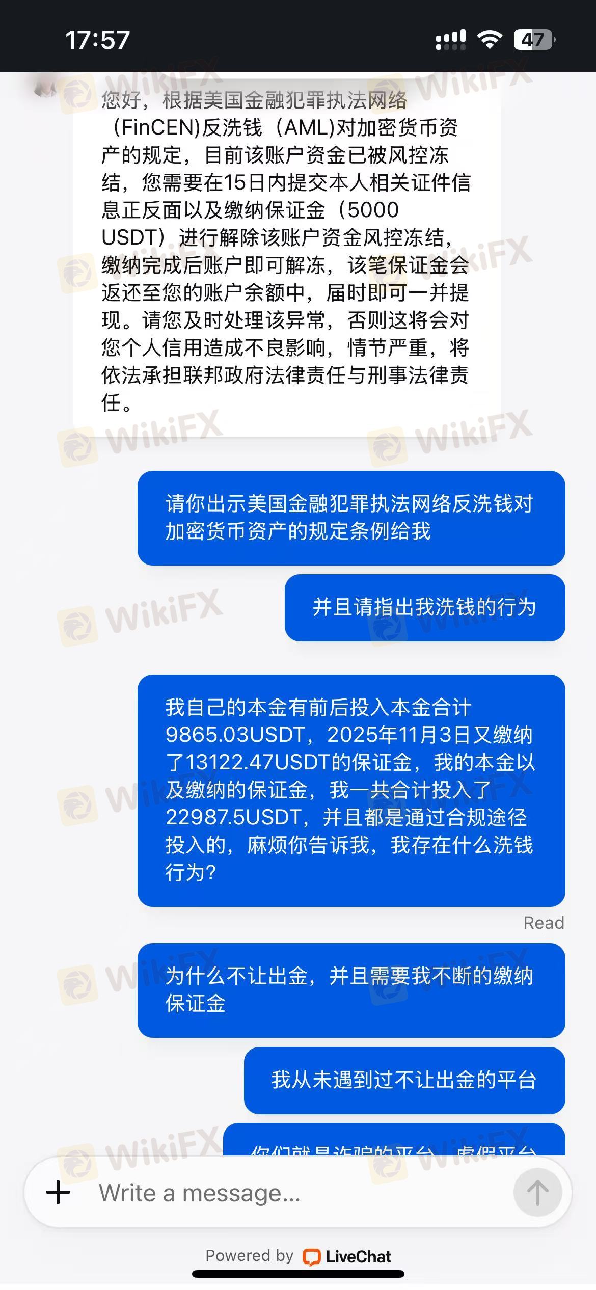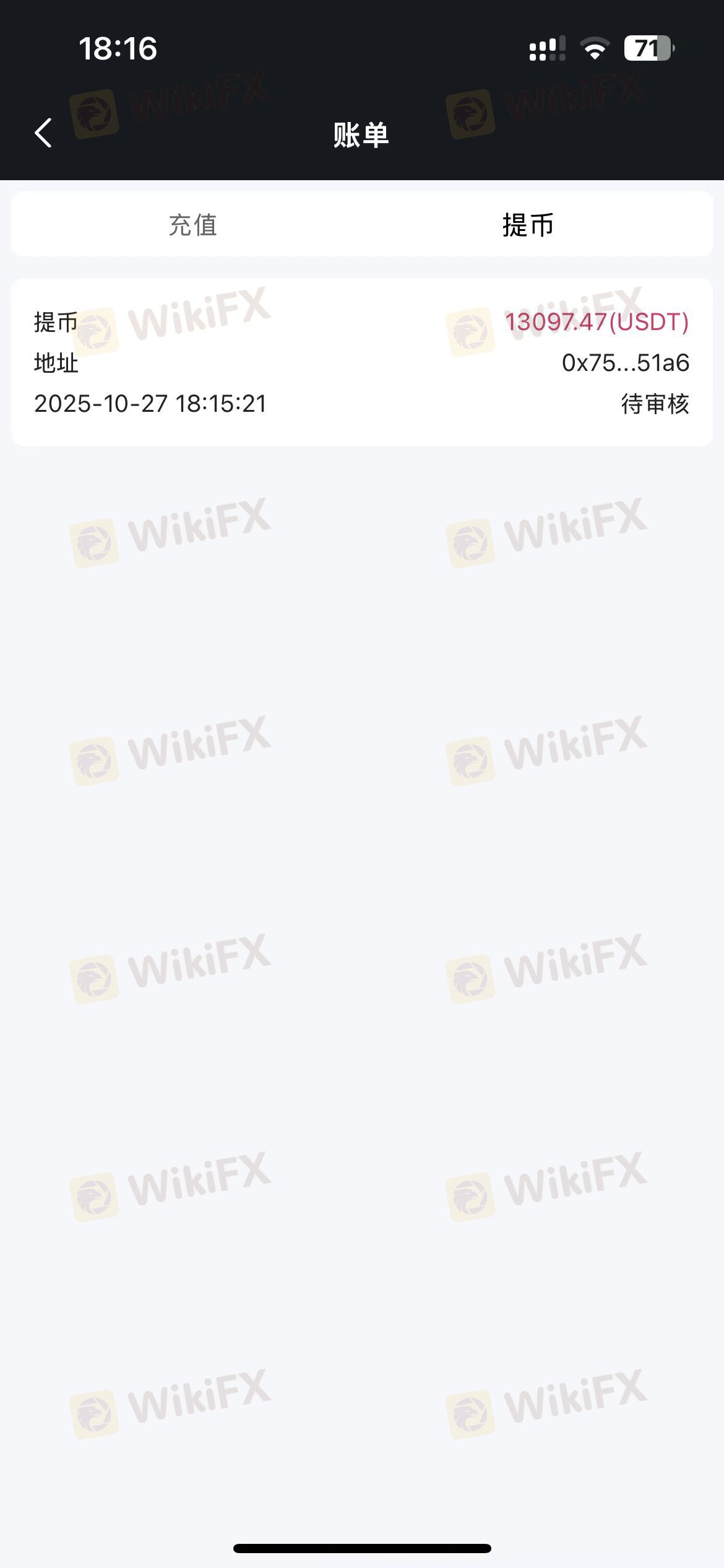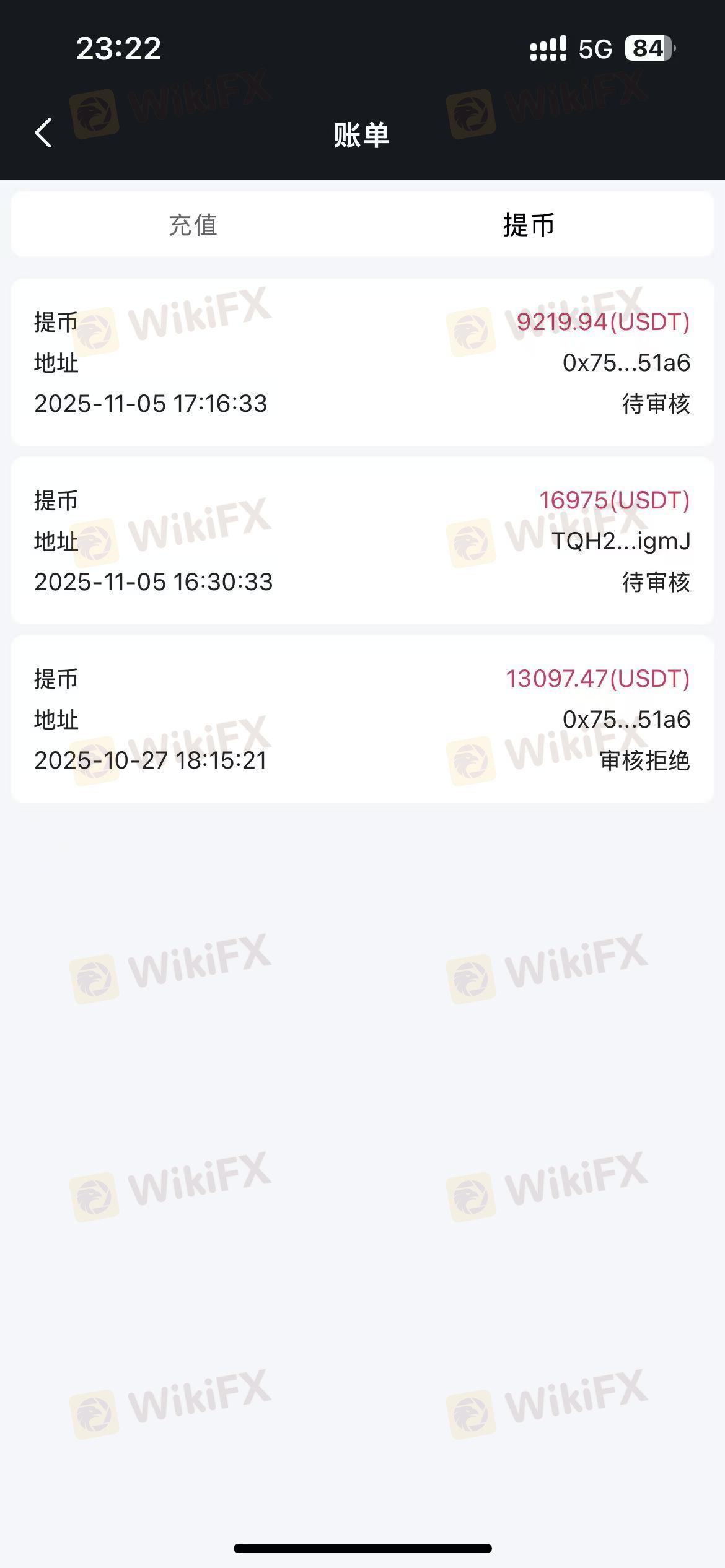 Hindi makapag-withdraw, kailangang patuloy na magbayad ng margin, at ang customer service ay hindi rin direktang sumasagot sa mga tanong. Ang unang pag-withdraw noong Oktubre 27, 2025 ay tinanggihan dahil sa hindi sapat na turnover at kailangan kong magbayad ng margin. Ang pangalawang pag-withdraw noong Nobyembre 4, 2025 ay tinanggihan din dahil sa alegasyon ng money laundering at kailangan kong magbayad muli ng 5000 USDT na margin. Sa madaling salita, hindi pinapayagan ang pag-withdraw at maaari pang i-freeze ang aking account. Kabuuan ng aking naipasok ay 22987.5 USDT.