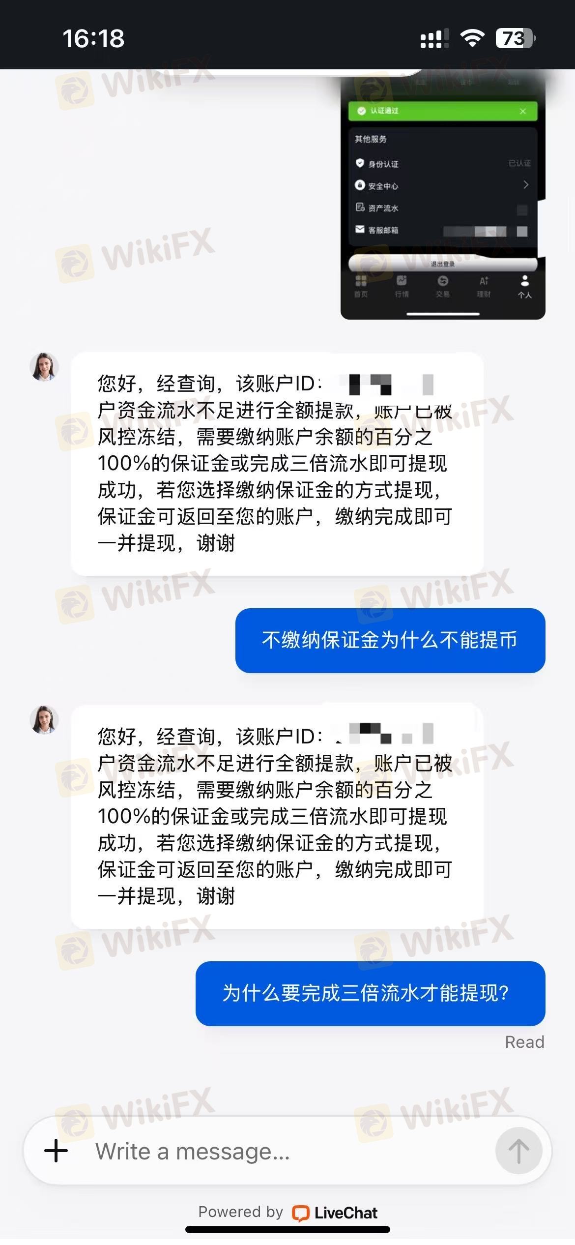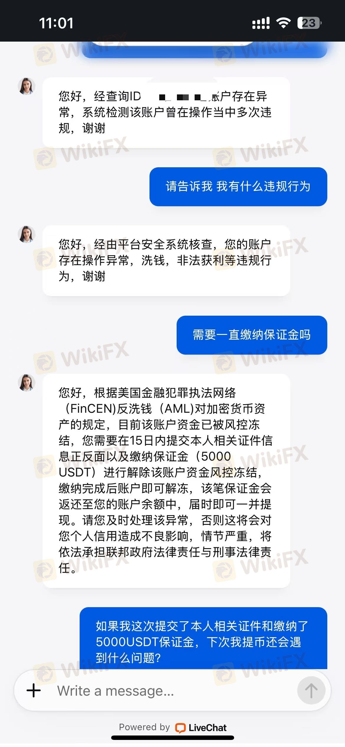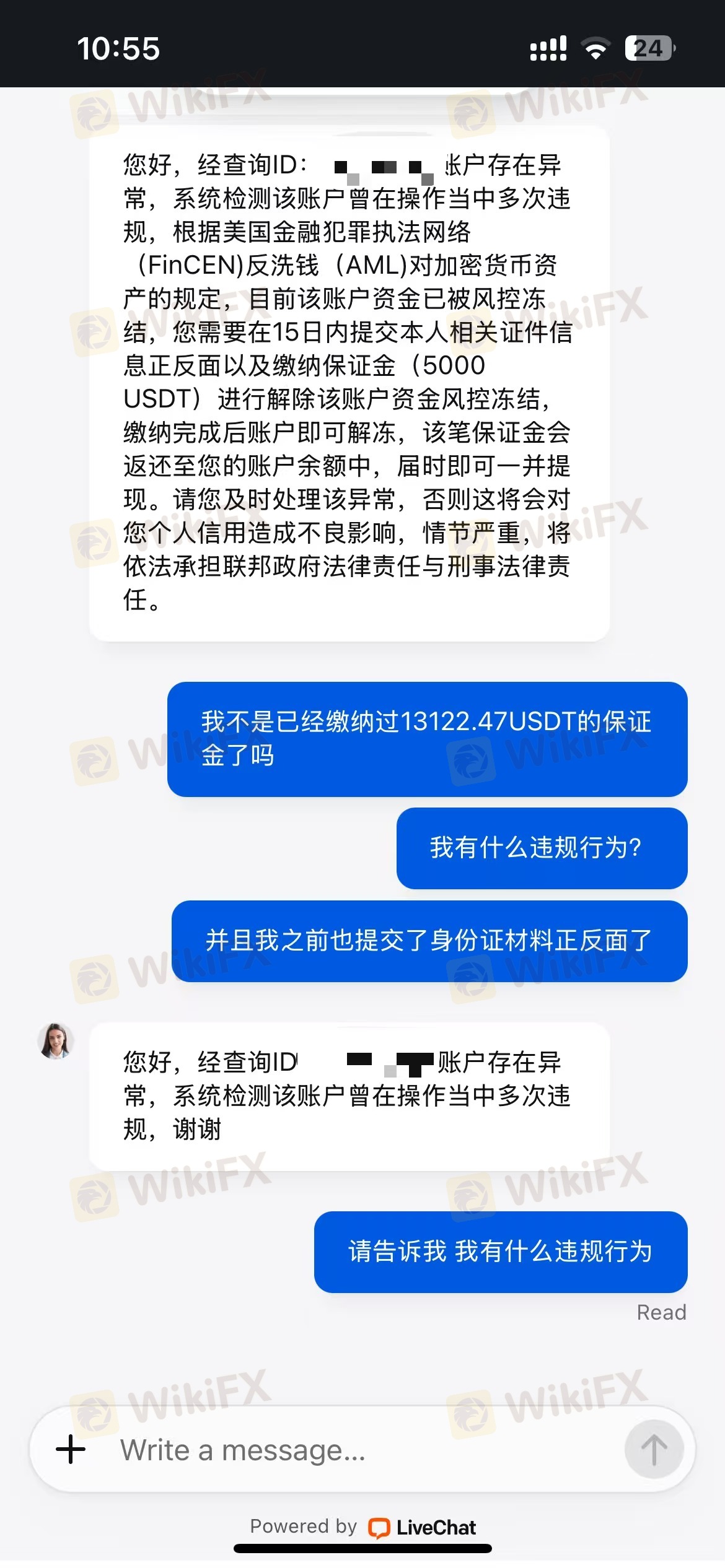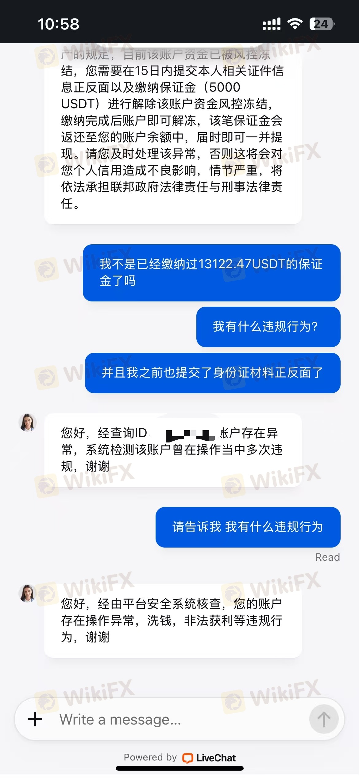Hindi makapag-withdraw, kailangang patuloy na magbayad ng margin, at ang customer service ay hindi rin direktang sumasagot sa mga tanong. Ang unang pag-withdraw noong Oktubre 27, 2025 ay tinanggihan dahil sa hindi sapat na turnover at kailangan kong magbayad ng margin. Ang pangalawang pag-withdraw noong Nobyembre 4, 2025 ay tinanggihan din dahil sa alegasyon ng money laundering at kailangan kong magbayad muli ng 5000 USDT na margin. Sa madaling salita, hindi pinapayagan ang pag-withdraw at maaari pang i-freeze ang aking account. Kabuuan ng aking naipasok ay 22987.5 USDT.