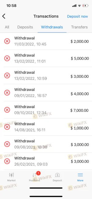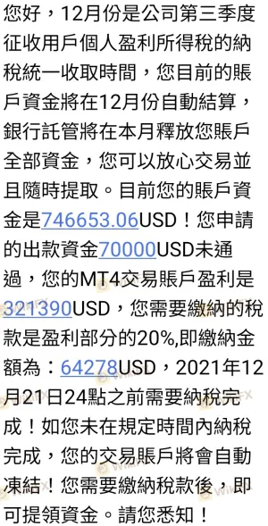 kapag nag-a-apply para sa isang withdrawal sa unang pagkakataon, ang platform ay nangangailangan ng pagbabayad ng 20% ng taunang buwis, 20% ng third-party na interbensyon margin, at isang 15% na parusa para sa mga paglabag sa operasyon, kung hindi ay ililipat ito sa ang awtoridad sa pangangasiwa. kailangan magbayad bago ang deadline para maiwasan ang account frozen.. kinakailangan na ang transaksyon ay hindi maaaring i-trade sa loob ng 6 na buwan at ang buong halaga ay dapat i-withdraw. pagkatapos tanggihan ang aplikasyon para sa withdrawal dahil sa hindi sapat na mga puntos ng kredito, kailangan mong magdeposito ng $12954.7 upang mapunan ang mga puntos ng kredito. kung ang mga puntos ng kredito ay hindi nabuo sa oras, ang account ay awtomatikong mapi-freeze. pagkatapos maaprubahan ang pag-withdraw, ngunit ang card ay naipit sa gilid ng bangko: sa unang pagkakataon na sinisingil ang 15% na bayad sa paghawak, at ang feedback ng customer service na natanggap ang bayad sa pangangasiwa sa loob ng 48 oras pagkatapos gawin ang pag-withdraw sa account, ngunit sa pangalawang pagkakataon ay sinabi nito na walang kamakailang transaksyon sa aking account. para sa mga talaan (na pinaghihigpitan ng platform at hindi maaaring ipagpalit), isang usd50000 na withdrawal na deposito ang dapat bayaran. <invalid Value> nangangailangan ng mga deposito para sa iba't ibang dahilan, kung hindi ay mapi-freeze ang account, at gumagamit din ito ng iba't ibang dahilan upang limitahan ang mga withdrawal kapag nag-withdraw.