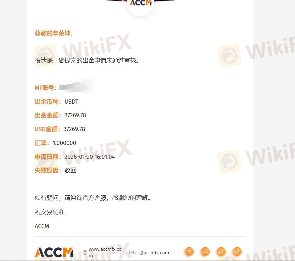 Nagtrade ako ng Forex sa platapormang ACCM AC. Nag-deposito ako ng kabuuang $30,000 USD at kumita ng $7,269.78 USD sa pamamagitan ng normal na pag-trade, na nagdala sa aking kabuuang balanse sa account sa $37,269.78 USD. Sa buong proseso ng pag-trade, hindi ako gumamit ng anumang ilegal na pamamaraan, kabilang ngunit hindi limitado sa arbitrage, hedging, mga plugin, o abnormal na pag-uugali sa pag-trade, at ang lahat ng transaksyon ay isinagawa nang normal. Gayunpaman, nang humiling ako ng withdrawal, ang plataporma, nang hindi nagbibigay ng anumang ebidensya o makatwirang paliwanag, ay direkta nang nagbawas ng lahat ng aking tubo na $7,269.78 USD, pinapayagan lamang akong i-withdraw ang aking prinsipal na $30,000 USD, at pagkatapos ay nag-freeze ng aking account, na nagbabawal sa pag-login at mga operasyon sa pondo. Nakipag-ugnayan na ako sa plataporma nang maraming beses sa pamamagitan ng email at naghain na ng reklamo sa mga kaugnay na ahensya ng regulasyon, ngunit ang plataporma ay wala pang ibinigay na anumang tugon o resolusyon. Ang pag-uugali ng plataporma ay seryosong abnormal: pagbabawas ng tubo nang walang anumang ebidensya ng ilegalidad; pag-freeze ng account upang maiwasan ang paglabas ng pondo; at ang customer service ay hindi maabot at tumatangging makipag-ugnayan. Malakas ang aking hinala na ang platapormang ito ay kasangkot sa panloloko at ilegal na operasyon, at pinaghihinalaang malisyosong nag-aangkin ng mga pondo ng kliyente. Ang kasalukuyang pagkawala ko ay $7269.78 USD (tubong binawas ng plataporma). Inilalantad ko nang publiko ang pag-uugali ng platapormang ito upang magbabala sa iba pang mga mamumuhunan na maging mapagbantay at maiwasan ang mga katulad na pagkawala. Kung patuloy na tatanggi ang plataporma na tugunan ang isyung ito, patuloy akong maghahain ng mga reklamo sa mas maraming internasyonal na ahensya ng regulasyon upang ilantad ang isyung ito sa buong mundo, at magsumite ng kumpletong ebidensya para sa karagdagang aksyon.