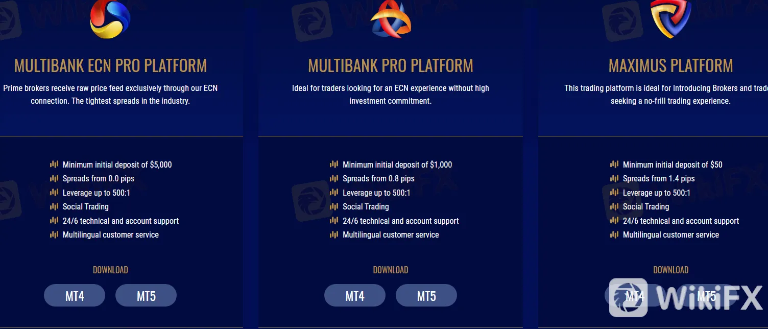 Nagbibigay ang Multibank Group sa mga negosyante ng maraming mga pagpipiliang platapormang pangkalakalan, ECN Pro, Multibank Pro, Maximus platform, MT4 at MT5 trading platform.