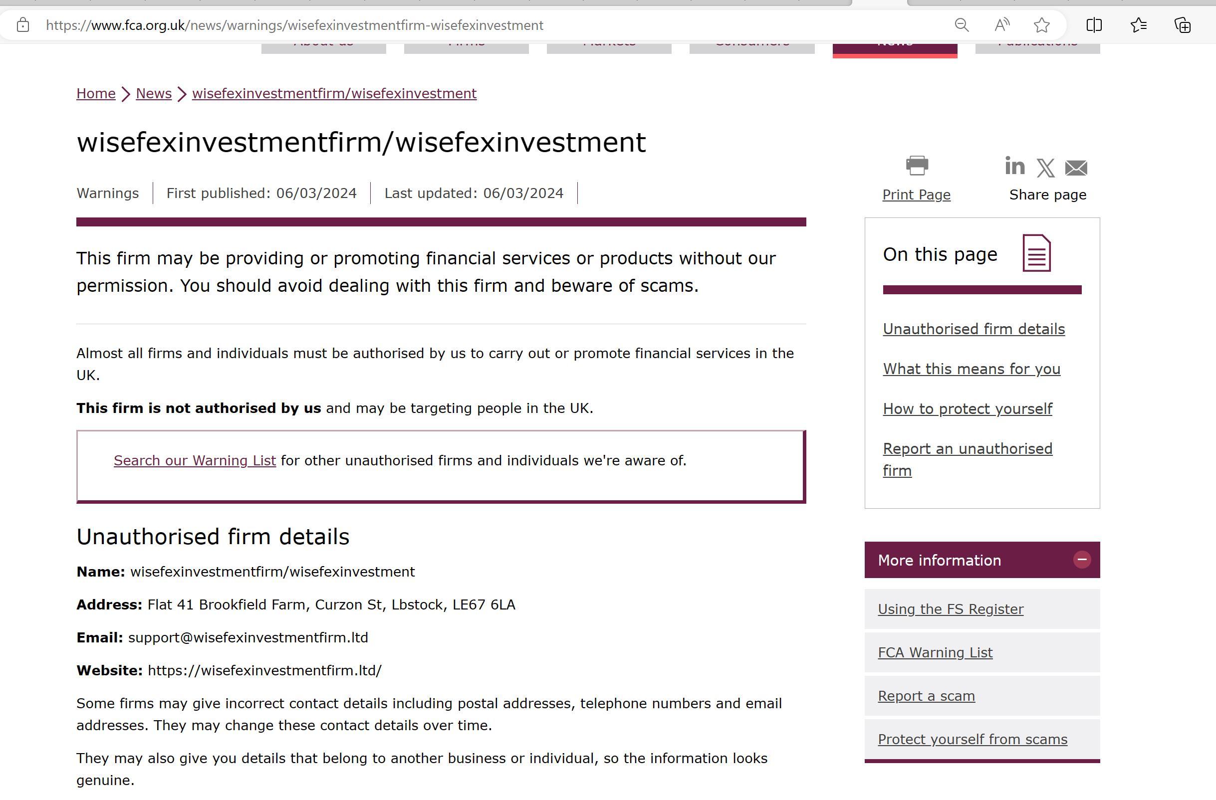 ang kumpanyang ito ay maaaring nagbibigay o nagpo-promote ng mga serbisyo o produkto sa pananalapi nang walang pahintulot namin. dapat mong iwasan ang pakikitungo sa kompanyang ito at mag-ingat sa mga scam. halos lahat ng mga kumpanya at indibidwal ay dapat na pinahintulutan namin na magsagawa o magsulong ng mga serbisyong pinansyal sa uk. ang firm na ito ay hindi namin pinahihintulutan at maaaring nagta-target ng mga tao sa uk. pangalan ng hindi awtorisadong detalye ng kumpanya: Wisefexinvestmentfirm /wisefexinvestment address: flat 41 brookfield farm, curzon st, lbstock, le67 6la email: support@ Wisefexinvestmentfirm .ltd website: https:// Wisefexinvestmentfirm .ltd/ ang ilang kumpanya ay maaaring magbigay ng mga maling detalye sa pakikipag-ugnayan kabilang ang mga postal address, numero ng telepono at email address. maaari nilang baguhin ang mga detalye ng contact na ito sa paglipas ng panahon. maaari rin silang magbigay sa iyo ng mga detalye na pagmamay-ari ng ibang negosyo o indibidwal, kaya ang impormasyon ay mukhang tunay.