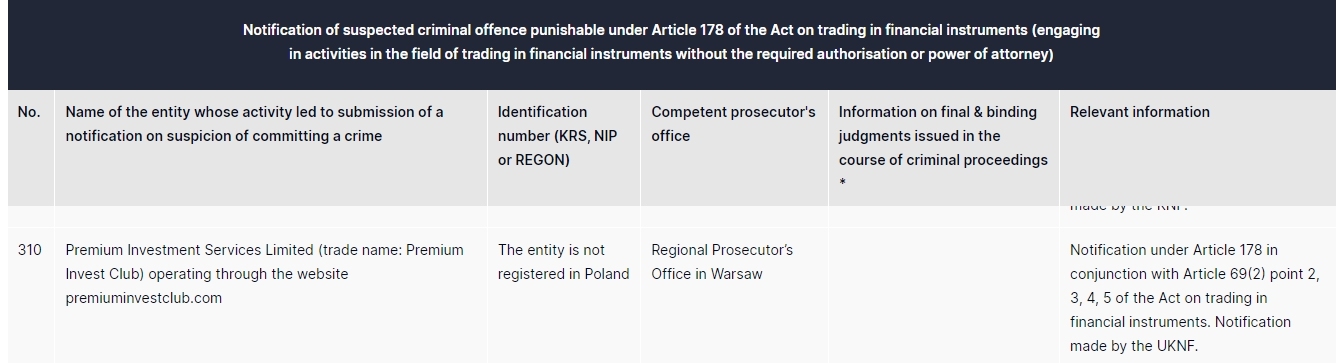 limitado ang mga serbisyo sa premium na pamumuhunan (pangalan ng kalakalan: Premium Invest Club ) na nagpapatakbo sa pamamagitan ng website na premiuminvestclub.com ang entity ay hindi nakarehistro sa poland regional prosecutor's office sa abiso sa warsaw sa ilalim ng artikulo 178 kasabay ng artikulo 69(2) punto 2, 3, 4, 5 ng batas sa pangangalakal sa mga instrumentong pinansyal. abiso na ginawa ng uknf.