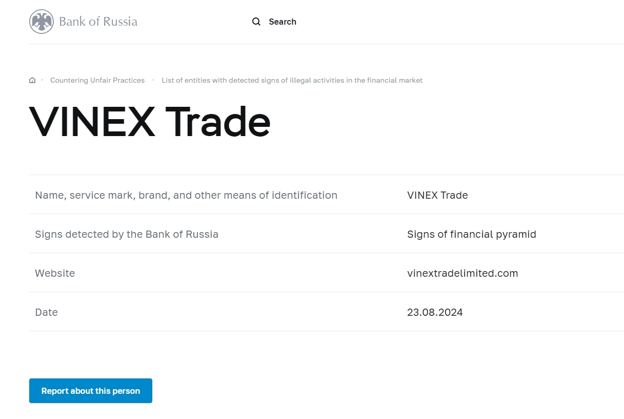 pangalan, marka ng serbisyo, tatak, at iba pang paraan ng pagkakakilanlan Vinex mga trade sign na nakita ng bank of russia signs of financial pyramid website Vinex tradelimited.com petsa 23.08.2024