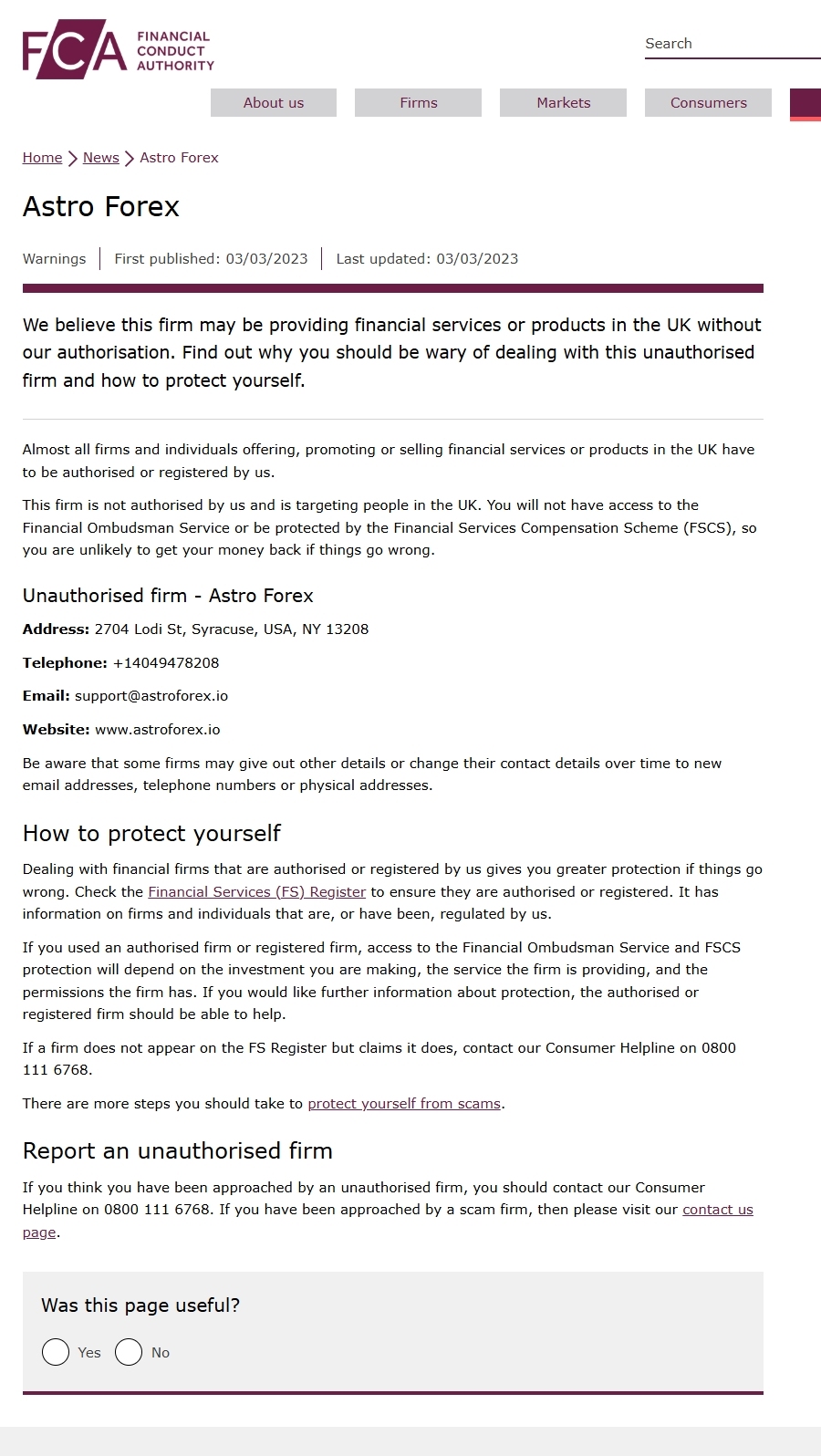 naniniwala kami na ang kumpanyang ito ay maaaring nagbibigay ng mga serbisyo o produkto sa pananalapi sa uk nang walang pahintulot namin. alamin kung bakit dapat kang maging maingat sa pakikitungo sa hindi awtorisadong kumpanyang ito at kung paano protektahan ang iyong sarili. halos lahat ng kumpanya at indibidwal na nag-aalok, nagpo-promote o nagbebenta ng mga serbisyo o produkto sa pananalapi sa uk ay kailangang awtorisado o irehistro sa amin. ang kumpanyang ito ay hindi pinahintulutan ng amin at nagta-target ng mga tao sa uk. hindi ka magkakaroon ng access sa serbisyo ng financial ombudsman o mapoprotektahan ng financial services compensation scheme (fscs), kaya malamang na hindi mo maibabalik ang iyong pera kung magkamali. hindi awtorisadong kumpanya - Astro Forex address: 2704 lodi st, syracuse, usa, ny 13208 telepono: +14049478208 email: support@astroforex.io website: www.astroforex.io magkaroon ng kamalayan na ang ilang mga kumpanya ay maaaring magbigay ng iba pang mga detalye o baguhin ang kanilang mga contact detail sa paglipas ng panahon sa mga bagong email address, numero ng telepono o pisikal na address. kung paano protektahan ang iyong sarili sa pakikitungo sa mga financial firm na awtorisado o nakarehistro sa amin ay nagbibigay sa iyo ng higit na proteksyon kung magkamali. suriin ang rehistro ng mga serbisyo sa pananalapi (fs) upang matiyak na sila ay awtorisado o nakarehistro. mayroon itong impormasyon sa mga kumpanya at indibidwal na, o naging, kinokontrol namin. kung gumamit ka ng awtorisadong kumpanya o rehistradong kumpanya, ang pag-access sa serbisyo ng financial ombudsman at proteksyon ng fscs ay depende sa puhunan na iyong ginagawa, ang serbisyong ibinibigay ng firm, at ang mga pahintulot na mayroon ang firm. kung gusto mo ng karagdagang impormasyon tungkol sa proteksyon, dapat makatulong ang awtorisado o nakarehistrong kumpanya. kung ang isang kompanya ay hindi lalabas sa fs register ngunit sinasabing lumalabas ito, makipag-ugnayan sa aming consumer helpline sa 0800 111 6768. may higit pang mga hakbang na dapat mong gawin upang protektahan ang iyong sarili mula sa mga scam.