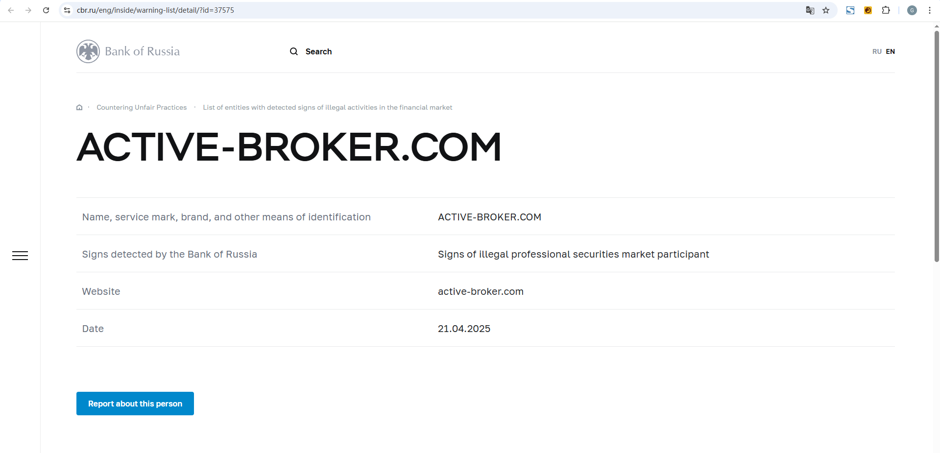 Pangalan, marka ng serbisyo, tatak, at iba pang paraan ng pagkakakilanlan ACTIVE-BROKER.COM Mga palatandaan na nakita ng Bank of Russia Mga palatandaan ng ilegal na propesyonal na kalahok sa merkado ng securities Website active-broker.com Petsa 21.04.2025