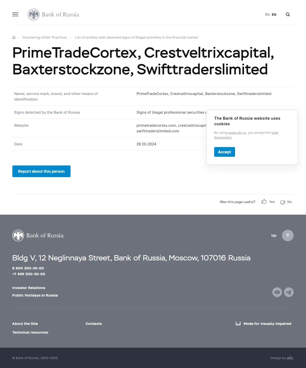 Listahan ng mga entidad na may natukoy na palatandaan ng ilegal na gawain sa pamilihang pinansyal PrimeTradeCortex, Crestveltrixcapital, Baxterstockzone, Swifttraderslimited.