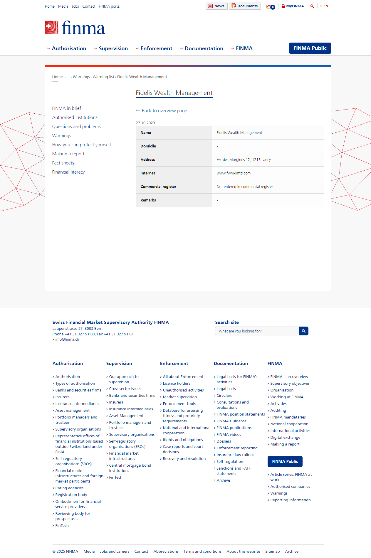 Listahan ng babala laban sa mga hindi awtorisadong kumpanya at indibidwal Babala sa publiko Listahan ng mga kumpanya at indibidwal na maaaring nagbibigay ng mga serbisyong hindi awtorisado at hindi sinu-superbisyunan ng FINMAFidelis Wealth Management.