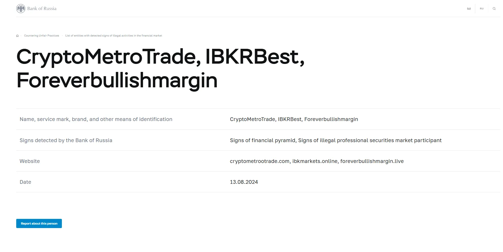 Pangalan, marka ng serbisyo, tatak, at iba pang paraan ng pagkilala CryptoMetroTrade, IBKRBest, Foreverbullishmargin Mga Palatandaang Natukoy ng Bangko ng Russia Mga Palatandaan ng piramideng pinansyal, Mga Palatandaan ng ilegal na propesyonal na kalahok sa merkado ng securities Website cryptometrootrade.com, ibkmarkets.online, foreverbullishmargin.live Petsa 13.08.2024.