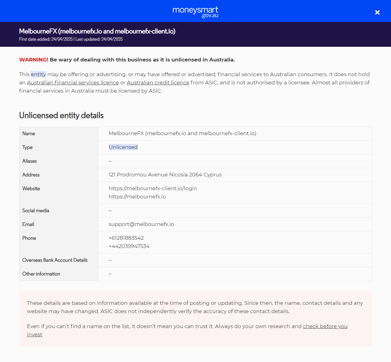 PangalanMelbourneFX (melbournefx.io at melbournefx-client.io) Uri Hindi lisensyadong pag-aalok ng mga serbisyong pampinansyal (kabilang ang mga produktong pampinansyal) sa mga tao sa Australia nang walang lisensya. Wala silang Australian financial services (AFS) licence o Australian credit licence mula sa ASIC. Mga Pangalan na Kilala Rin– Address 121 Prodromou Avenue Nicosia 2064 Cyprus Websitehttps://melbournefx-client.io/loginhttps://melbournefx.io Social media– Email support@melbournefx.io Telepono +61281883542+442039947534 Mga Detalye ng Bank Account sa Ibang Bansa– Iba pang impormasyon–.