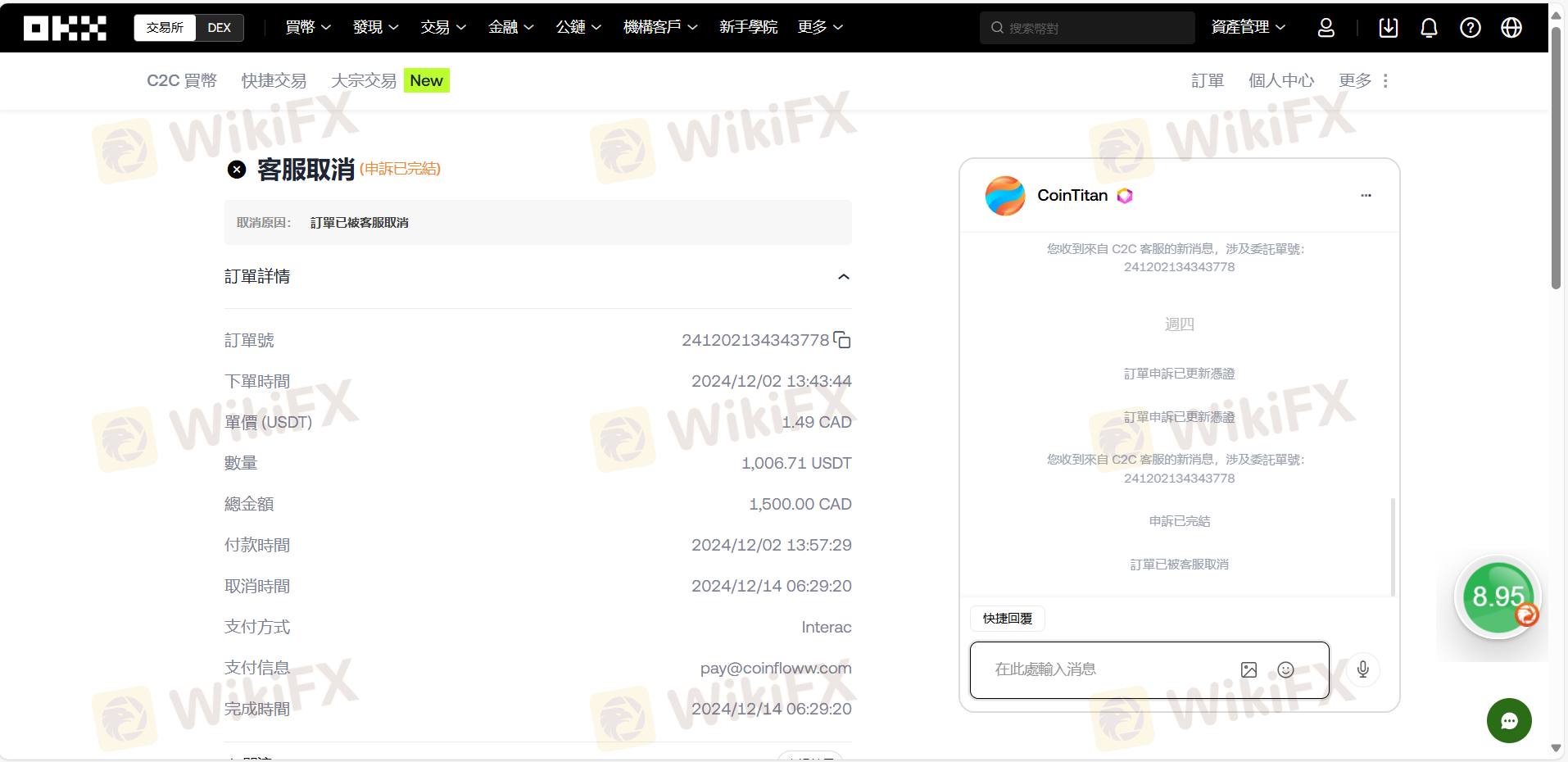 我向OKX平台的C2C商家在12月2日買了價值CAD 1500的USDT。依照賣家的付款方式以interac付款,我提供付款紀錄,廠商稱未收款拒絕交付USDT。 我向OKX官方申訴,官方持續要求我提供資料,我按照要求提供付款紀錄同時以未剪接影片錄下我的網路銀行付款紀錄,OKX聲稱調查。調查多日後將我訂單取消,賣家可以不必付款。