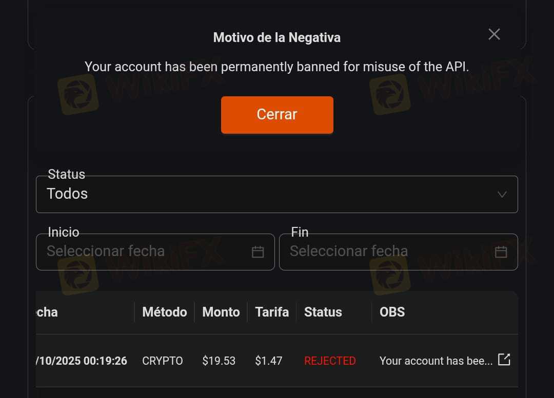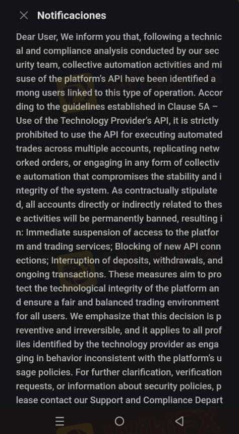 C'est une arnaque, ils ne permettent pas les retraits et ils bannissent les utilisateurs comme ils l'ont fait avec moi. "Cher utilisateur, nous vous informons qu'après une analyse technique et de conformité réalisée par notre équipe de sécurité, des activités d'automatisation collective et une utilisation inappropriée de l'API de la plateforme ont été identifiées parmi les utilisateurs liés à ce type d'opération. Conformément aux directives énoncées dans la Clause 5A : utilisation de l'API du fournisseur de technologie, il est strictement interdit d'utiliser l'API pour exécuter des opérations automatisées sur plusieurs comptes, répliquer des ordres en réseau ou participer à toute forme d'automatisation collective qui compromet la stabilité et l'intégrité du système. Comme stipulé contractuellement, tous les comptes directement ou indirectement liés à ces activités seront définitivement bannis, ce qui entraînera suspension immédiate de l'accès à la plateforme...