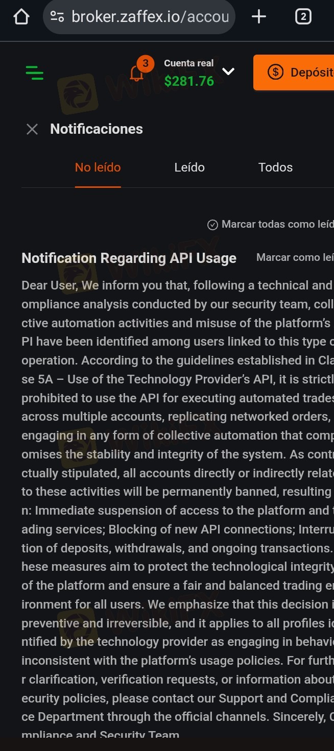 Plainte Formelle pour Fraude et Détention Illégale de Capitaux (Broker Zaffex) Déposée auprès de WikiFX Date : 9 octobre 2025 Objet : Alerte de Fraude : Blocage total des retraits, bannissement massif de comptes et changement de domaine par le broker Zaffex. Données de l'Investisseur Affecté : | Catégorie | Information | | :--- | :--- | | Nom Complet : | Saúl García | | ID de Compte chez Zaffex : | 01JNQ9S1X658TZD0EYSH1S0G6P | | Adresse Email : | saulbarcelona1023@gmail.com | | Montant Total Bloqué : | 50.69 USD | | Montant à Retirer (Exigé) : | 50 USD | Je soussigné, Saúl García (ID : 01JNQ9S1X658TZD0EYSH1S0G6P), porte plainte contre Zaffex pour fraude. En octobre 2025, le broker a changé son domaine et a banni mon compte sans justification, empêchant le retrait de mes fonds. Auparavant, ils avaient bloqué ma vérification (KYC). J'exige la Libération de 50 USD. Je demande à WikiFX d'enquêter sur ce schéma de vol et d'alerter la communauté des investisseurs. Contact : saulbarcelona1023@gmail.com