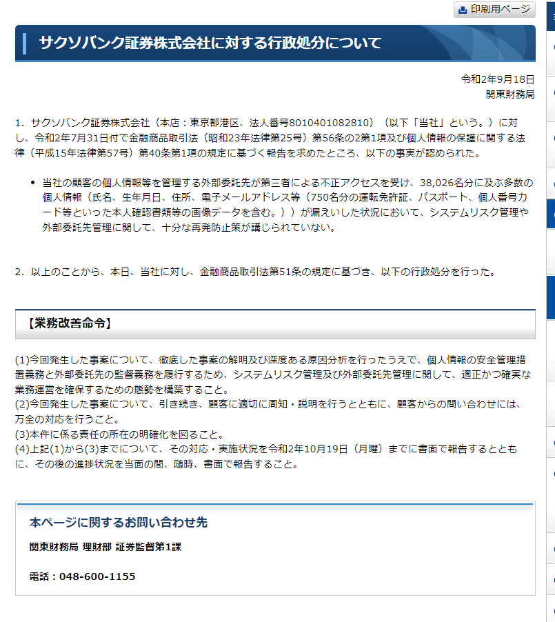 Saxo BanqueBureau local des finances de Kanto 18 septembre 2020 concernant les actions administratives contre Securities Co., Ltd. 1. Saxo Banque Securities Co., Ltd. (siège social : Minato-ku, Tokyo, numéro d'entreprise 8010401082810) (ci-après dénommée « notre société »), le 31 juillet 2020, la loi sur les instruments financiers et les échanges (loi n° 25 de 1948 ) n° 56 Lorsque nous avons demandé un rapport sur la base des dispositions de l'article 2, paragraphe 1 et de la loi sur la protection des informations personnelles (loi n° 57 de 2003), article 40, paragraphe 1, nous avons constaté les faits suivants. Une société de sous-traitance qui gère les informations personnelles de nos clients a été consultée illégalement par un tiers, et un grand nombre d'informations personnelles (noms, dates de naissance, adresses, adresses e-mail, etc. de 750 clients) pour 38 026 clients Y compris les données d'image telles que les documents d'identification tels que les permis de conduire, les passeports, les cartes individuelles, etc.)))), des mesures suffisantes de prévention des récidives n'ont pas été prises concernant la gestion des risques du système et la gestion des sous-traitants. 2. Sur la base de ce qui précède, les mesures administratives suivantes ont été prises contre la Société aujourd'hui conformément aux dispositions de l'article 51 de la loi sur les instruments financiers et les échanges. [Ordonnance d'amélioration commerciale] (1) Après avoir soigneusement clarifié l'incident et procédé à une analyse approfondie de la cause de l'incident, le système sera mis en œuvre afin de remplir l'obligation de prendre des mesures de contrôle de sécurité pour les informations personnelles et l'obligation de surveiller les sous-traitants Construire un système pour assurer des opérations commerciales appropriées et fiables en ce qui concerne la gestion des risques et la gestion des sous-traitants. (2) Continuer à informer et à expliquer de manière appropriée aux clients l'incident qui s'est produit cette fois-ci, et prendre toutes les mesures possibles pour répondre aux demandes des clients. (3) Clarifier le lieu de responsabilité pour cette affaire. (4) En ce qui concerne (1) à (3) ci-dessus, nous ferons rapport par écrit d'ici le 19 octobre 2020 (lundi) sur l'état de la réponse et de la mise en œuvre, et pour le moment, si nécessaire, sur les progrès par la suite. l'écriture.