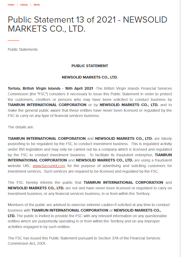 déclaration publique 13 de 2021 - NewSolid marchés co., ltd. déclarations publiques déclaration publique NewSolid marchés co., ltd. tortola, îles vierges britanniques - 16 avril 2021 - la commission des services financiers des îles vierges britanniques (la "fsc") considère qu'il est nécessaire de publier cette déclaration publique afin de protéger les clients, les créanciers ou les personnes qui pourraient avoir été sollicitées pour faire des affaires par Tianrun International société ou par NewSolid marchés co., ltd. et de faire savoir au grand public que ces entités n'ont jamais été autorisées ou réglementées par la fsc pour exercer tout type d'activité de services financiers. les détails sont : Tianrun International société et NewSolid marchés co., ltd. prétendent à tort être réglementés par la fsc pour mener des activités d'investissement. il s'agit d'une activité réglementée en vertu de la législation bvi et ne peut être exercée que par une société agréée et réglementée par la fsc pour mener des activités d'investissement. pour faciliter son entreprise frauduleuse, Tianrun International société et NewSolid marchés co., ltd. utilisent une URL de site Web frauduleuse : www. Tianrun int.com dans le but de faire de la publicité et de solliciter des clients pour des services d'investissement. ces services doivent être agréés et réglementés par la fsc. le fsc informe par la présente le public que Tianrun International société et NewSolid marchés co., ltd. ne sont pas et n'ont jamais été agréés ou réglementés pour exercer des activités d'investissement ou des activités de services financiers sur le territoire ou à partir de celui-ci. les membres du public sont invités à faire preuve d'une extrême prudence s'ils sont sollicités à tout moment pour faire affaire avec Tianrun International société ou NewSolid marchés co., ltd. le public est invité à fournir au fsc toute information pertinente sur toute entité douteuse qui opère prétendument sur ou depuis le territoire et sur toute activité inappropriée menée par ces entités. la fsc a publié cette déclaration publique conformément à l'article 37a de la loi de 2001 sur la commission des services financiers.