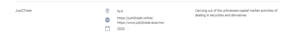 "cette section contient la liste des sites Web, des produits d'investissement, des entreprises et des particuliers non autorisés. cette liste comprend : les personnes exerçant ou se présentant comme exerçant les activités réglementées suivantes sans autorisation de la sc : négociation de valeurs ; négociation de produits dérivés ; gestion de fonds ; conseil en financement d'entreprise ; conseil en investissement ; planification financière ; et négoce de régimes de retraite privés. personnes exploitant un marché reconnu sans autorisation. personnes émettant ou offrant des valeurs mobilières sans approbation, autorisation ou reconnaissance. personnes utilisant à mauvais escient le logo de sc et dénaturant le sc. " Just2Trade s/o https:// Just2Trade .en ligne/ https://www. Just2Trade .asia/ms/ 2020 exercice des activités non autorisées sur le marché des capitaux consistant à négocier des valeurs mobilières et des produits dérivés