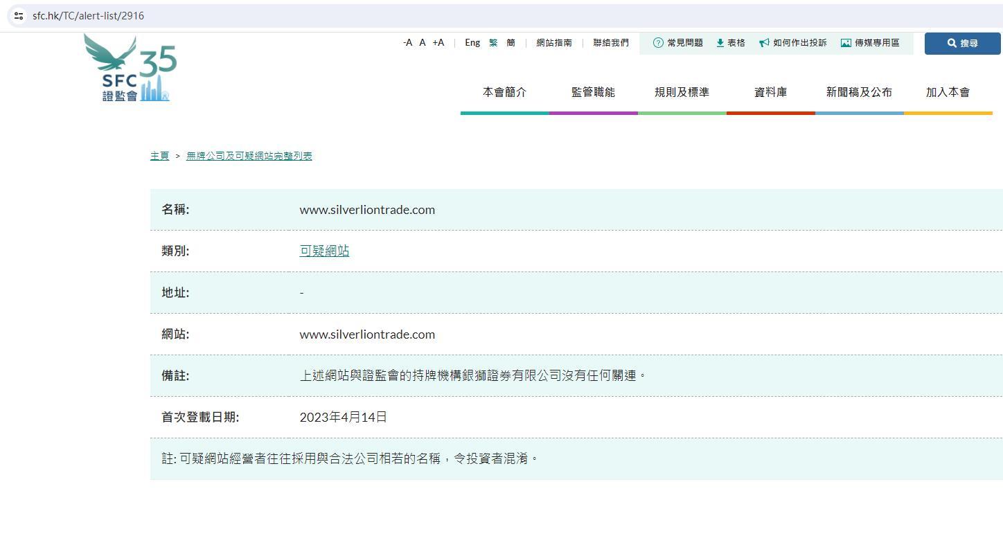 La liste des sociétés sans licence et des sites Web suspects répertorie les sociétés qui ne sont pas autorisées à Hong Kong et qui ont attiré l'attention du SFC. Ces sociétés sont soupçonnées de cibler ou d'avoir ciblé les investisseurs de Hong Kong, ou de prétendre avoir des liens avec Hong Kong. Vous pouvez effectuer une recherche par nom ou par catégorie pour vérifier si une entreprise est incluse dans la liste. Cette liste n'est pas exhaustive. Comme la Securities and Futures Commission découvre souvent des sociétés ou des sites Web intéressants, nous ajouterons de nouveaux noms à la liste de temps en temps. Si vous avez été contacté par une entreprise non agréée, veuillez utiliser notre formulaire de réclamation en ligne. Pour plus d’informations sur les chaufferies, les sites Internet frauduleux et les faux emails, veuillez cliquer sur les liens correspondants. Remarque : La liste des sociétés non agréées et des sites Web suspects a pour but d'alerter les investisseurs le plus tôt possible. Les investisseurs ne doivent pas se fier uniquement aux informations figurant dans la liste ci-dessus et doivent vérifier eux-mêmes soigneusement les détails de chaque entreprise. Veuillez sélectionner la première lettre anglaise du nom dans chaque colonne pour afficher la liste, ou cliquez sur la colonne « Nom chinois » pour afficher uniquement les sociétés portant un nom chinois. " Nom : www.silverliontrade.com Catégorie : Adresse du site Web suspect : - Site Web : www.silverliontrade.com Remarque : Le site Web ci-dessus n'a aucun lien avec Silver Lion Securities Limited, une institution agréée par la Securities and Futures Commission. Date de première publication : avril 2023 Note du 14 : les opérateurs de sites Web suspects utilisent souvent des noms similaires à des entreprises légitimes pour semer la confusion chez les investisseurs.