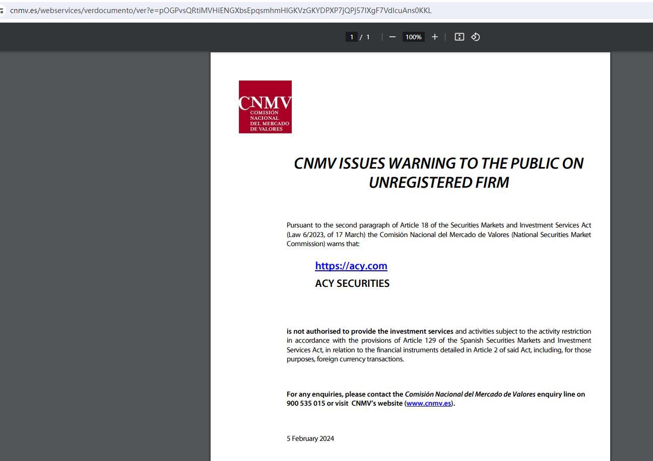 • Raison de la punition https://acy.com ACY Securities n'est pas autorisé à fournir les services et activités d'investissement soumis à la restriction d'activité conformément aux dispositions de l'article 129 de la loi espagnole sur les marchés de valeurs mobilières et les services d'investissement