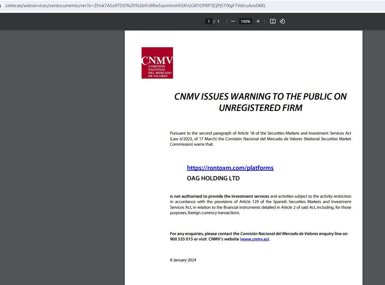 • Raison de la punition https:// RontoXM .com/platforms oag holding ltd n'est pas autorisé à fournir les services et activités d'investissement soumis à la restriction d'activité conformément aux dispositions de l'article 129 de la loi espagnole sur les marchés de valeurs mobilières et les services d'investissement.