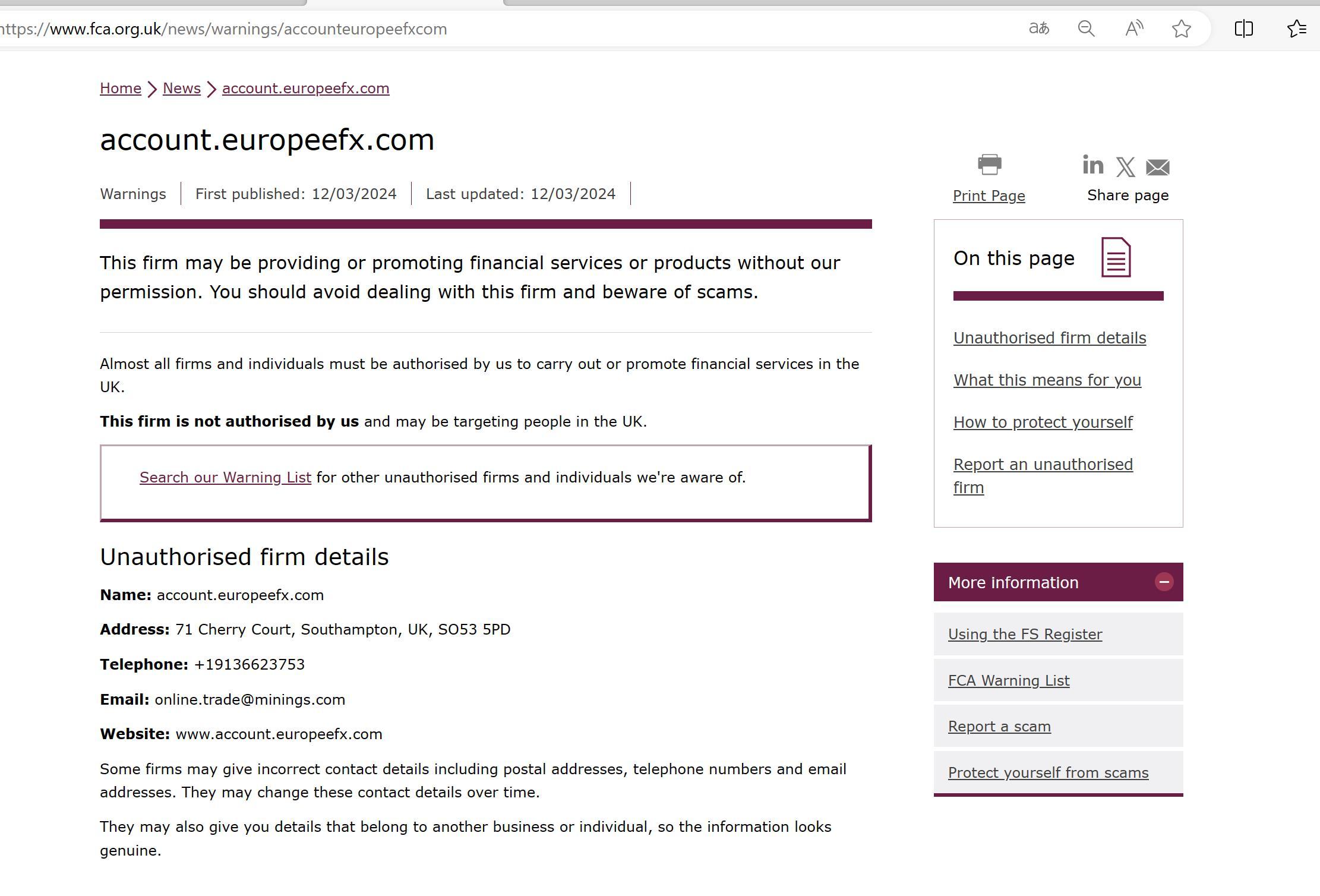 Première publication : 12/03/2024 Dernière mise à jour : 12/03/2024 Cette société peut fournir ou promouvoir des services ou des produits financiers sans notre autorisation. Vous devez éviter de traiter avec cette entreprise et vous méfier des escroqueries. Presque toutes les entreprises et les particuliers doivent être autorisés par nous pour proposer ou promouvoir des services financiers au Royaume-Uni. Cette entreprise n'est pas autorisée par nous et peut cibler des personnes au Royaume-Uni. Recherchez dans notre liste d'avertissement les autres entreprises et individus non autorisés dont nous avons connaissance. Détails non autorisés de l'entreprise Nom : account.europeefx.com Adresse : 71 Cherry Court, Southampton, UK, SO53 5PD Téléphone : +19136623753 E-mail : online.trade@minings.com Site Web : www.account.europeefx.com Certaines entreprises peuvent donner un contact incorrect les détails, y compris les adresses postales, les numéros de téléphone et les adresses e-mail. Ils peuvent modifier ces coordonnées au fil du temps. Ils peuvent également vous donner des détails appartenant à une autre entreprise ou à un autre individu, afin que les informations semblent authentiques.