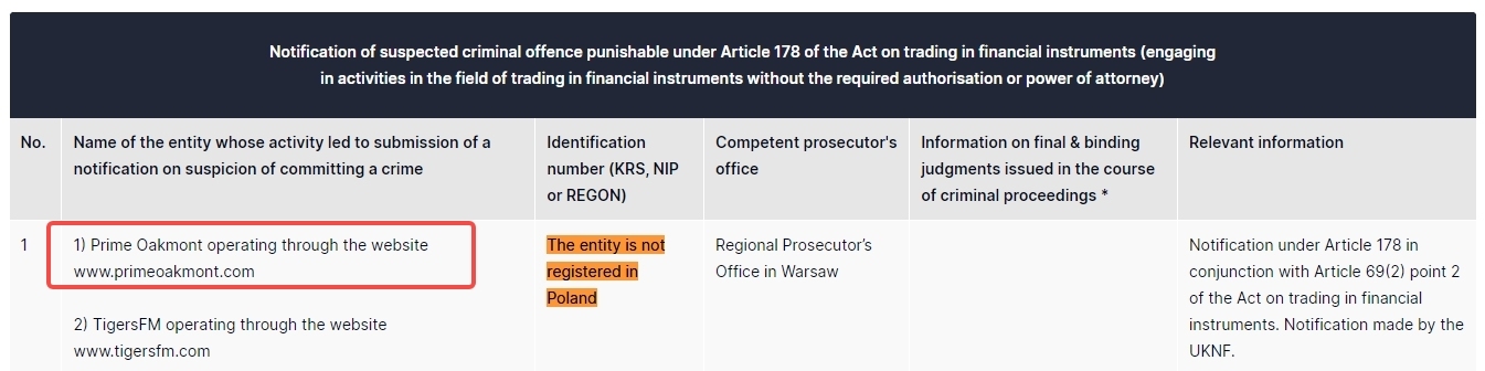 1) Prime Oakmont opérant via le site Web www. PrimeOakmont .com l'entité n'est pas enregistrée auprès du parquet régional de Pologne à Varsovie notification en vertu de l'article 178 en liaison avec l'article 69, paragraphe 2, point 2 de la loi sur le commerce d'instruments financiers. notification faite par l'uknf.